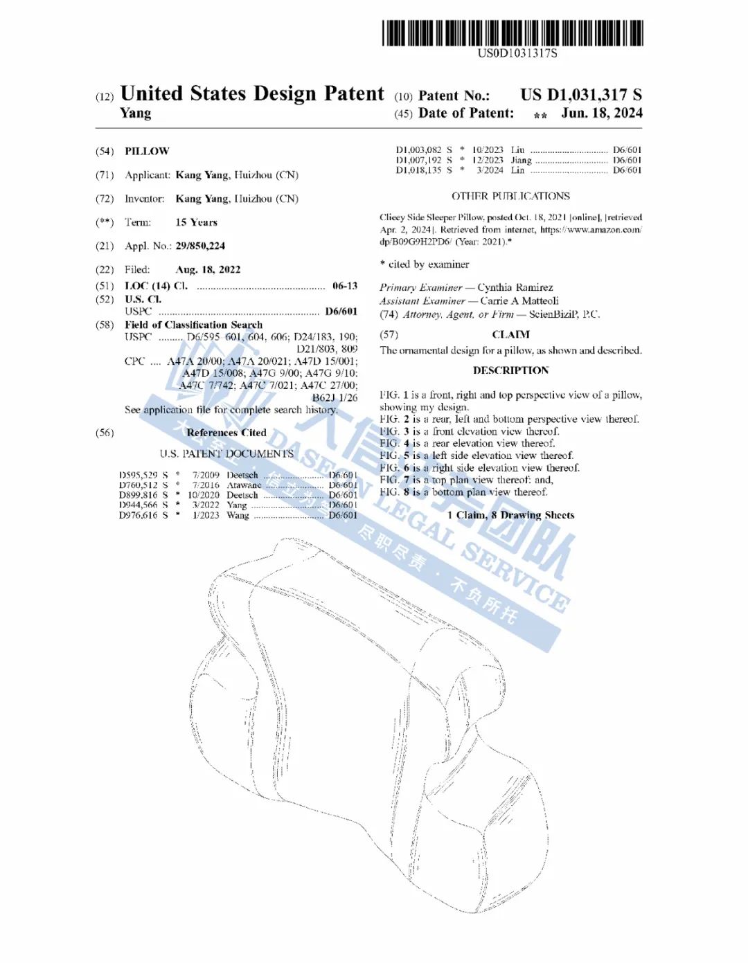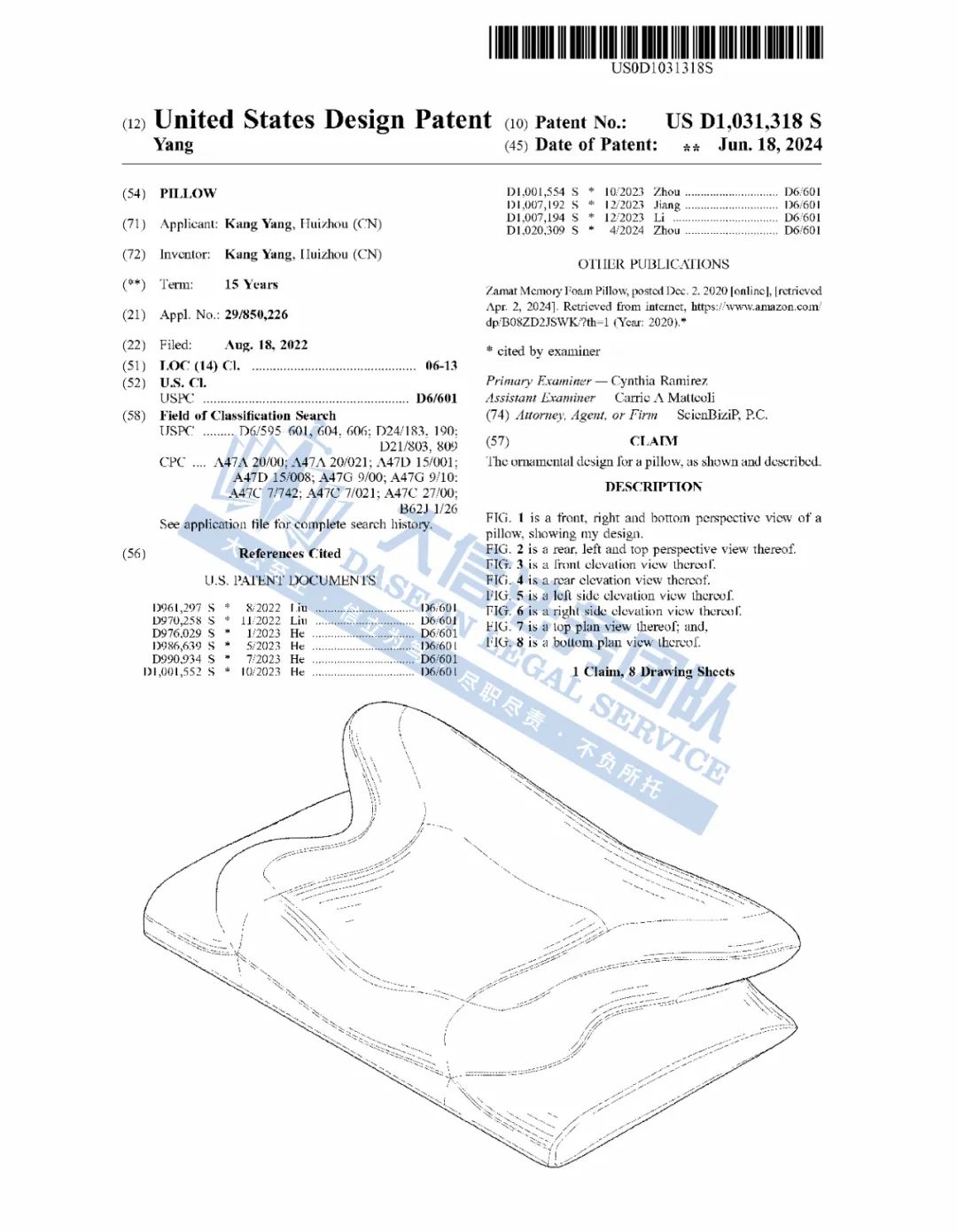 02 Pillow 记忆枕头专利维权 案件号:24-cv-06137 立案时间:2024年7月21日 原告:Kang Yang 代理律所:Aptum Law 原告介绍 原告是一位国人卖家,其设计的蝴蝶型枕头采用蝴蝶形状设计,能够精准贴合颈部轮廓,维持最适宜的高度,确保头部与身体、脊柱的自然对齐,让每一次翻身都伴随着舒适与放松。X形枕头则采用与记忆泡沫枕头的巧妙融合,一定程度上帮助用户减少长时间侧睡造成的细纹、浮肿、皱纹。