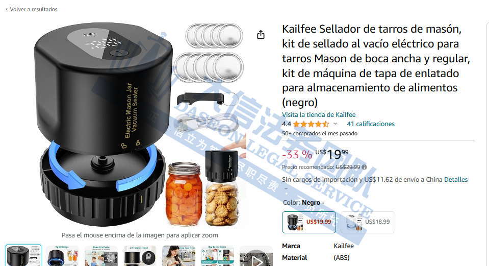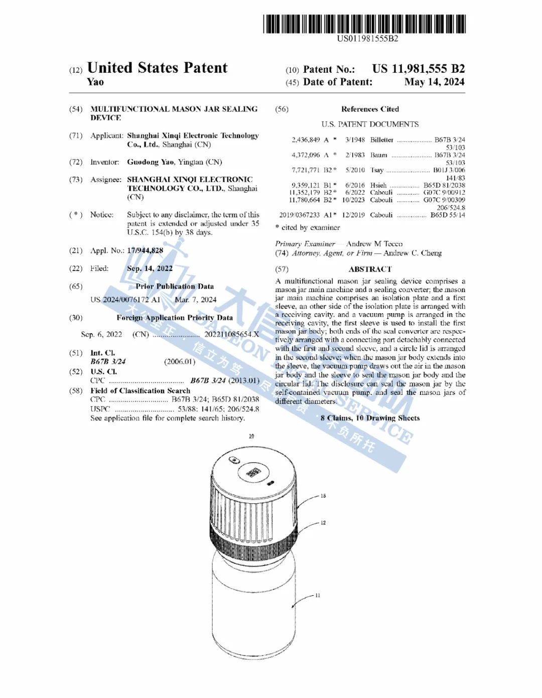 03 多功能电动梅森罐密封器专利维权 案件号:24-cv-06100 立案时间:2024年7月19日 原告:Shanghai Xinqi Electronic Technology Co., Ltd 代理律所:AVEK IP, LLC 原告介绍 原告是一家成立于2018年的上海公司,专注于从事家用密封产品的设计、采购、销售业务,电动梅森罐密封器是一种用于密封梅森罐等玻璃容器的小型电动工具,通过抽真空的方式来实现对罐内食品的保鲜和密封。电动梅森罐密封器采用电动设计,操作简便快捷,省去了手动抽真空的繁琐步骤,适合户外野餐时密封食物,防止食物变质。