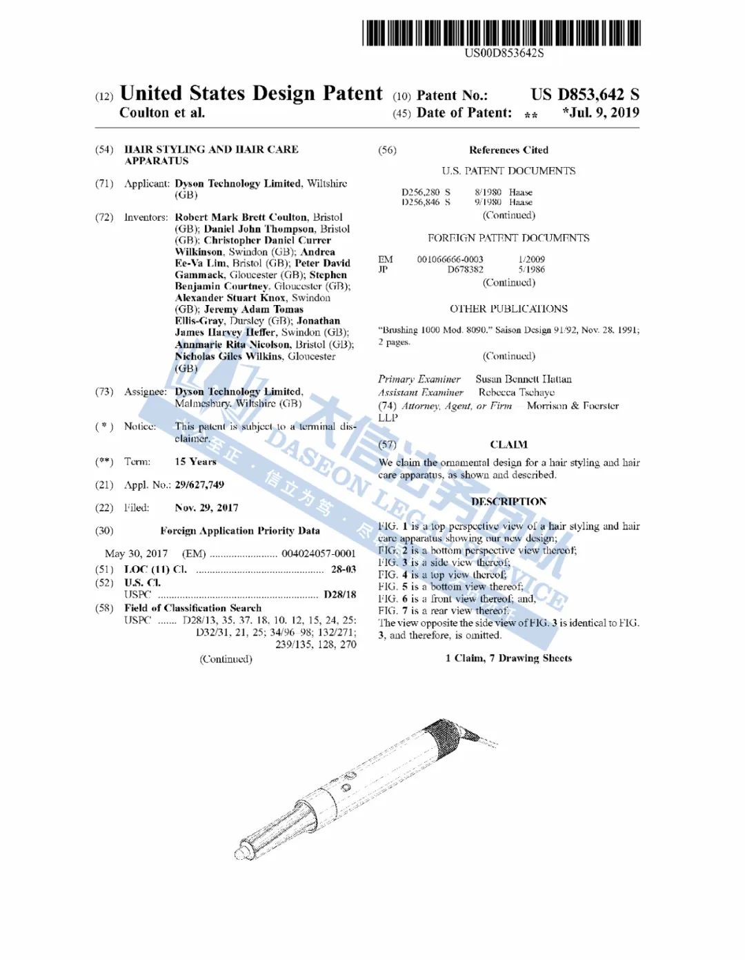 案件分析 此案涉及的是卷发棒的专利维权,以下是专利信息,戴森是TRO维权常客,近两年立案数十起,涉及电池、吹风机、卷发棒等多个专利,以及商标维权等。侵权风险极大!相关卖家注意排查!