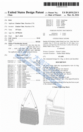 Zemiao Chen网眼包专利维权 案件号:24-cv-60863 立案时间:2024年5月21日 原告:Zemiao Chen 代理律所:Palmer Law Group, PA 原告介绍 原告Zemiao Chen是来自于广东深圳的亚马逊卖家,网眼包产品的设计深受客户的喜爱。产品的外形由优质的皮革制成,可调节的肩带,可伸展的底部以便容纳更多的物品。产品展示如下: