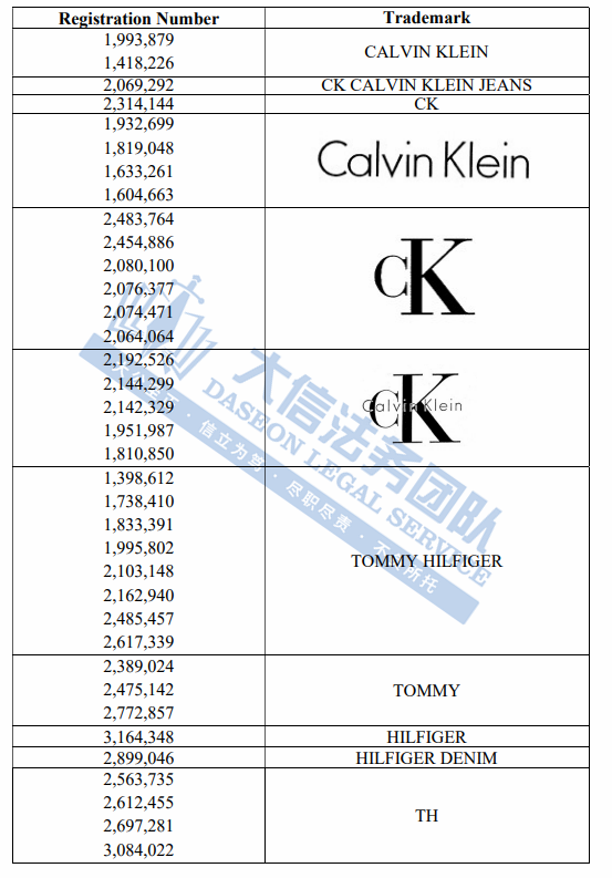Ck和Tommy品牌商标维权 案件号:24-cv-06637 立案时间:2024年7月30日 原告:Calvin Klein Trademark Trust et al 代理律所:GBC 原告介绍 原告Calvin Klein Trademark Trust作为Calvin Klein与TOMMY Hilfiger品牌商标的坚实后盾,长期致力于全球范围内的商标保护。Calvin Klein是一个源自美国纽约的全球知名时尚生活方式品牌,于1968年在美国创立,Tommy Hilfiger由Tommy Hilfiger于1985年创立。该品牌以休闲、舒适、时尚的服饰风格著称。两大品牌均处于中高端市场,其品牌价值的维护对于保持市场竞争力至关重要。