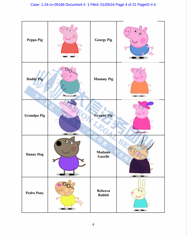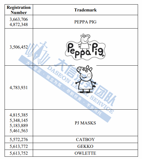 03 动画Peppa Pig和PJ Masks商标维权 案件号:24-cv-06706 立案时间:2024年7月31日 原告:Hasbro Consumer Products Licensing Limited 代理律所:GBC 原告介绍 原告Hasbro于1923年成立于美国,是一家制作和发行公司,专门从事娱乐内容的开发、收购、制作、融资、发行和销售,包括动画电视连续剧《小猪佩奇 Peppa Pig》和《睡衣小英雄 PJ Masks》。 Peppa Pig是一部由Hasbro和Karrot 动画公司导演和制作的学前动画电视连续剧,最初于2004年5月播出,深受全球学龄前儿童喜爱。Peppa Pig和PJ Masks在全球范围内拥有极高的知名度和影响力,其相关消费品涵盖了服装、玩具、文具等多个品类。