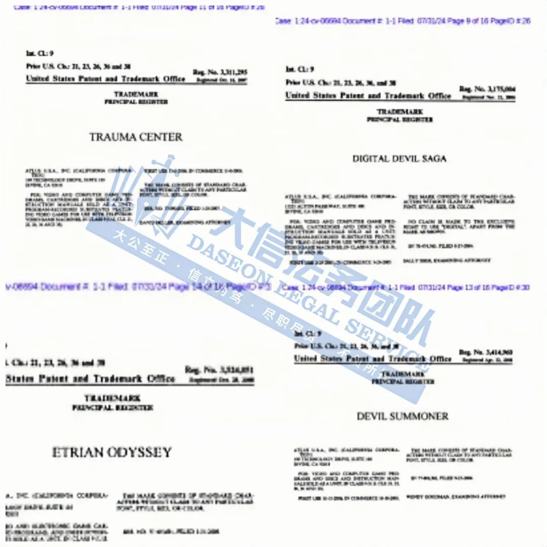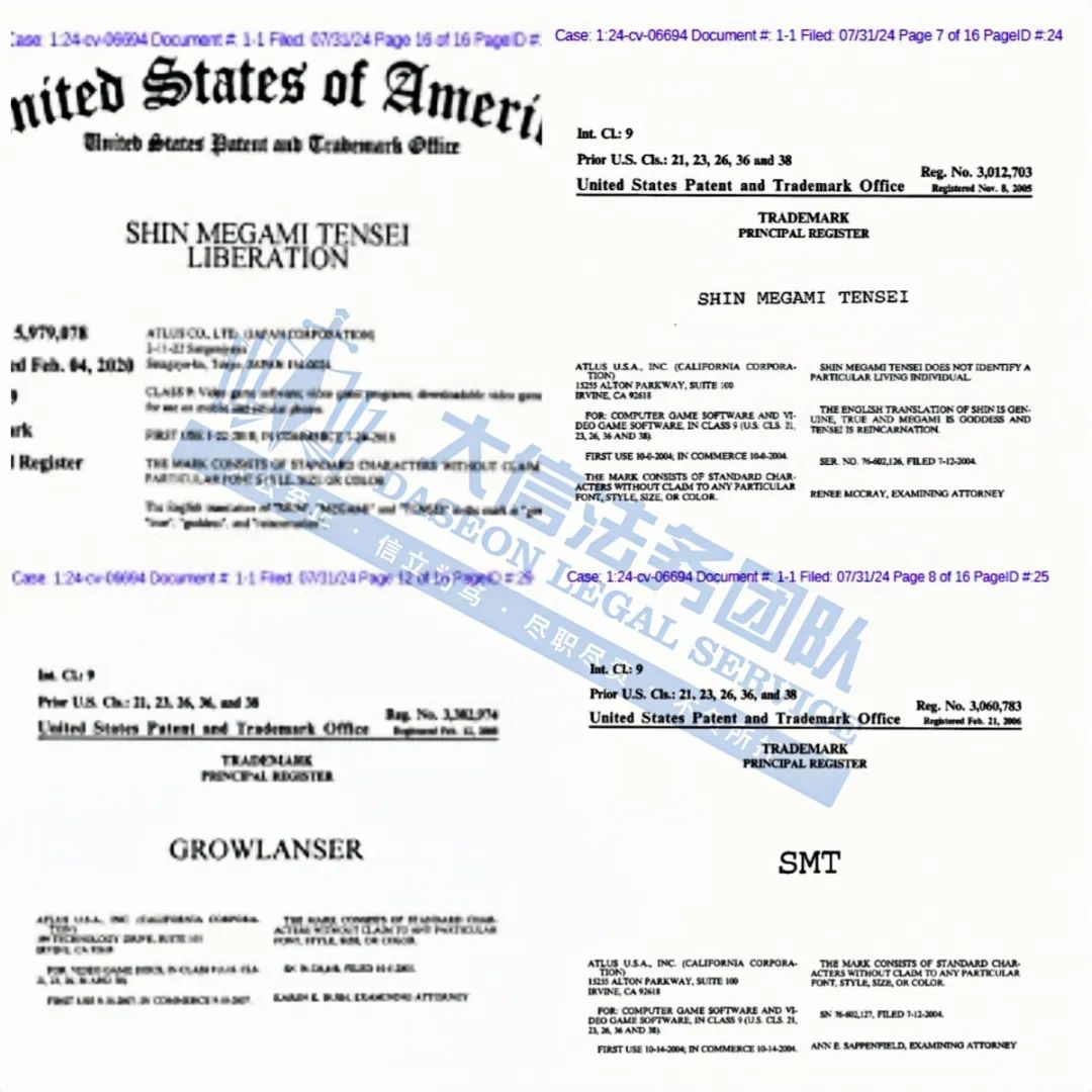 03 PERSONA商标维权 案件号:24-cv-06694 立案时间:2024年7月31日 原告:Sega Corporation et al 代理律所:HSP 原告介绍 原告SEGA Corporation),是日本一家电子游戏公司,2003年和日本SAMMY公司合并,名称整合为SEGA-SAMMY。本次案件涉及的SHIN MEGAMI TENSEI(《真·女神转生》)是一款由SEGA-SAMMY旗下的全资子公司株式会社Atlus(株式会社アトラス,英文Atlus Co., Ltd)是开发的角色扮演游戏,是《女神转生》系列的续作,于1992年10月30日发行。