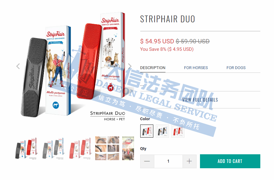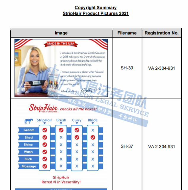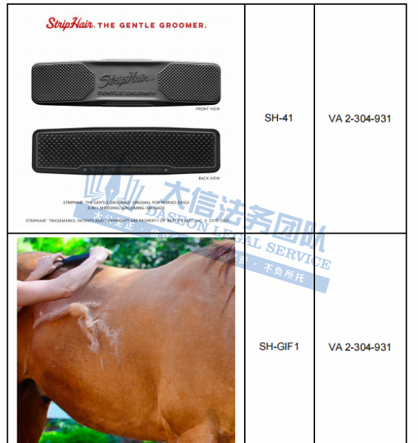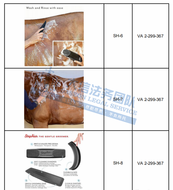 原告Betty’s Best, Inc. 是一家专注于宠物美容工具设计与销售的公司,创始人是致力于为宠物提供温和、舒适的美容工具的一名马匹和宠物美容师Betty。Striphair Groomer是Betty设计的一款宠物脱毛工具,由柔软柔韧的天然橡胶制成,贴合身体,该产品具有独特的六合一温和梳理设计,可舒适地脱毛、梳理、洗发、刮擦、擦亮和按摩,能够给宠物带来更舒适的梳理体验,适用于日常使用。官网:https://striphair.com/