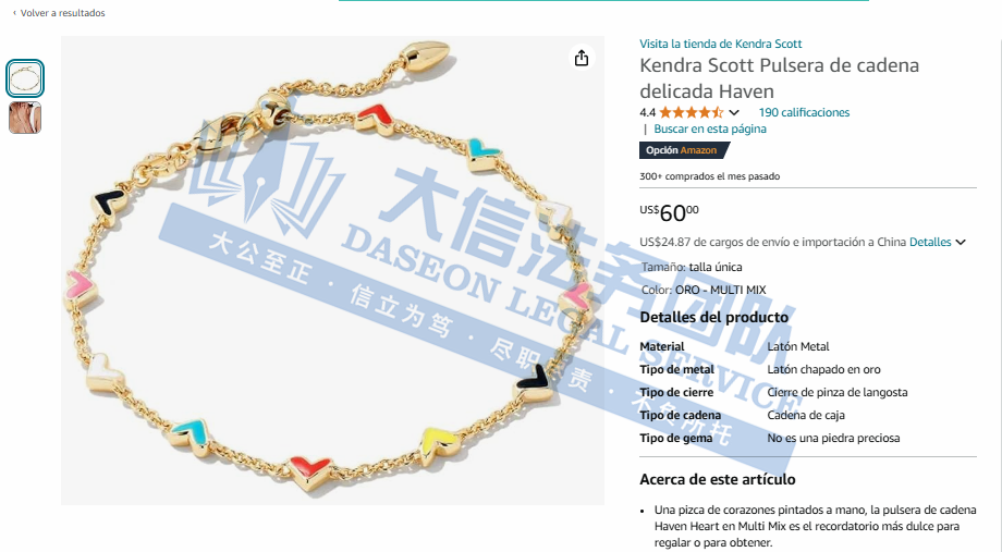 原告成立于2002年的Kendra Scott是一家位于美国在珠宝设计界相当年轻的品牌。由年轻貌美的设计师Kendra Scott创立。Kendra Scott在珠宝设计方面有着独特的天赋和热情,她的设计风格独特,充满了创意和个性。她的设计灵感来源于生活中的各种元素,如自然、艺术、文化等,她将这些元素融入到自己的设计中,创造出了一系列独特而美丽的珠宝作品。她的作品也被刊登在主流杂志的重要位置,还被知名时尚设计师作为时尚珠宝系列所展示。