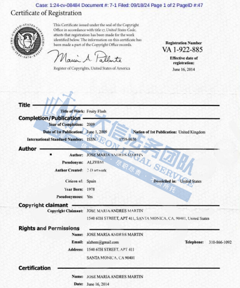 此案涉及版权维权,原告旗下一张版权画:Fruity Flash,于2014年取得美国版权证书,版权注册号为VA1-922-855,跨境卖家尽快排查,未经授权不可直接使用图片,避免侵权损失!
