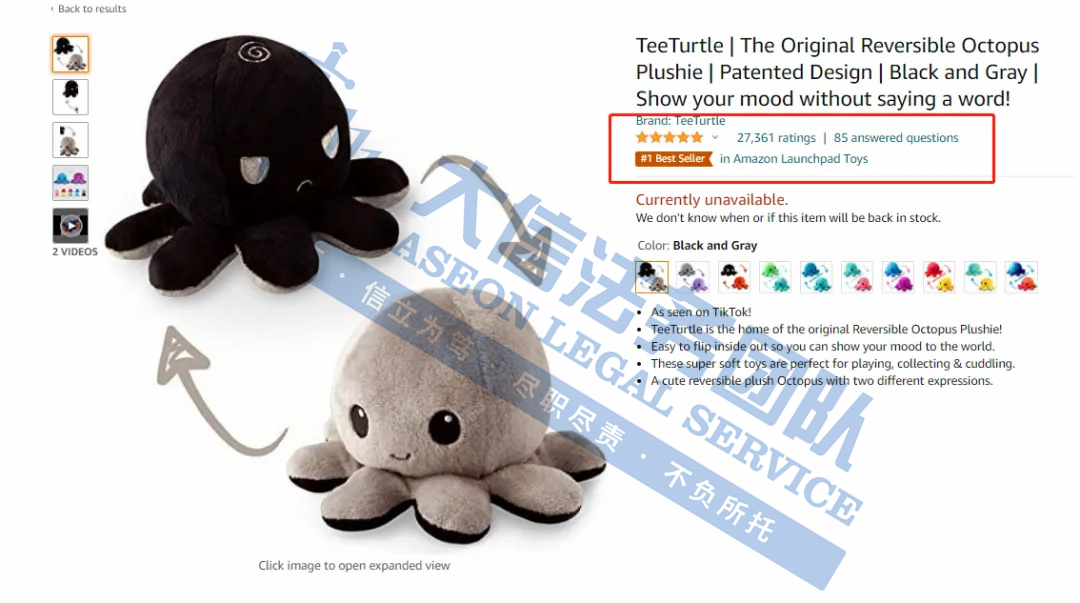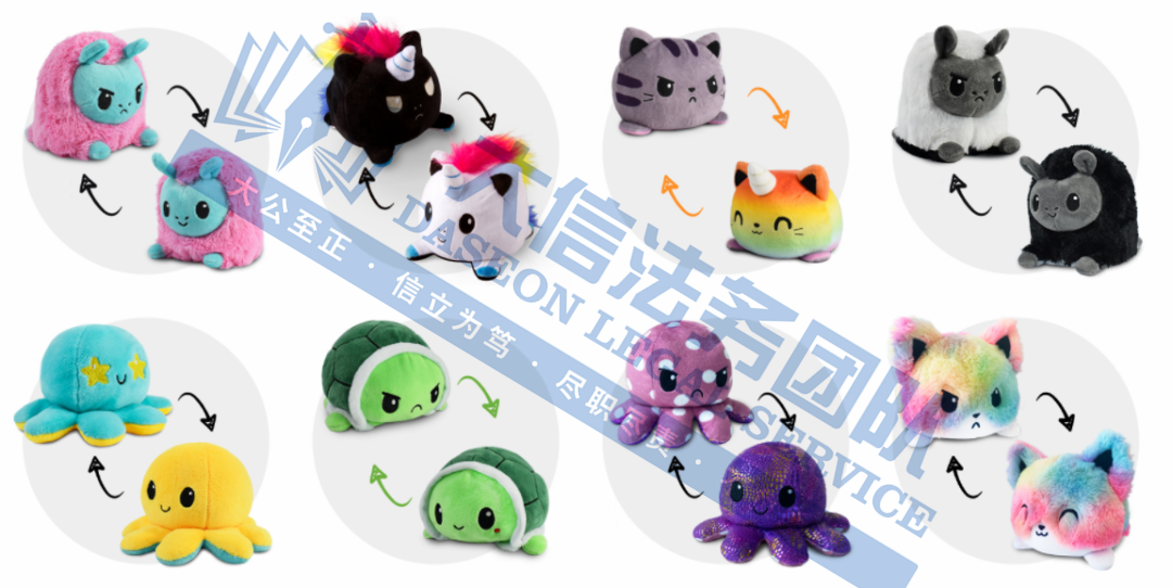 原告TEE TURTLE是一个由设计师Ramy Badie在2012年创立的创意品牌,其主营产品包括各种原创T恤、毛绒玩具以及卡牌桌游等。TEE TURTLE其最知名的产品之一是翻转毛绒玩偶。这款玩偶因其独特的双面设计而受到广泛喜爱,通过简单的翻转动作,玩偶可以展示不同的情绪表情,除了章鱼形象外,TEE TURTLE还拥有猫、恐龙、狗、狐狸、龟、独角兽等多个玩偶形象;深受年轻人和潮流爱好者的追捧。