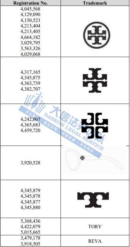 此案涉及商标维权,Tory Burch的标志性LOGO——由正反两个字母T组成的图案,注册种类包括燃料油脂类、珠宝钟表类、皮革皮具类、布料床单类、服装鞋帽类等。相关卖家尽快排查自家产品,避免侵权造成损失!
