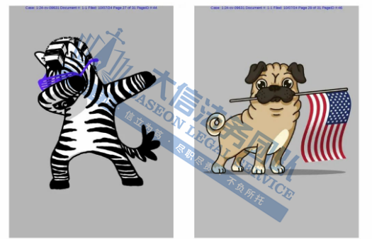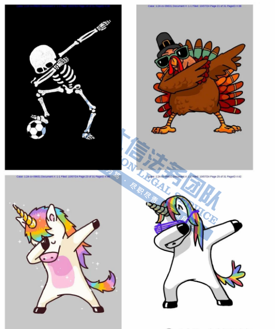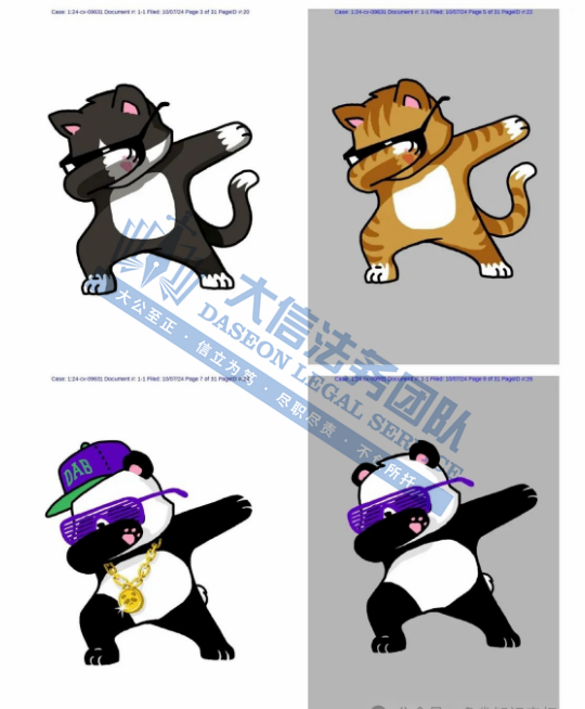 05 Swag手势动物插画版权维权 案件号:24-cv-09631 立案时间:2024年10月7日 原告:Rafael Marcio Melillo Bastos 代理律所:Keith 原告介绍 原告Rafael Marcio Melillo Bastos 是一名来自巴西的插画家和艺术家。他的作品以独特的插图风格和富有故事感的图案为特色。巴斯托斯的绘画灵感大多来源于他的曾祖母,因此他在出售他的每一件作品时都使用了她曾祖母的名字“Vó Maria”作为标记,也作为他的另一个自我。他的版权画主题通常以卡通形象为主,充满童趣且富含故事性。画作风格独特,多为动物摇滚后摆出 “swag” 的动作,十分搞怪,展现出动物幽默风趣的一面。