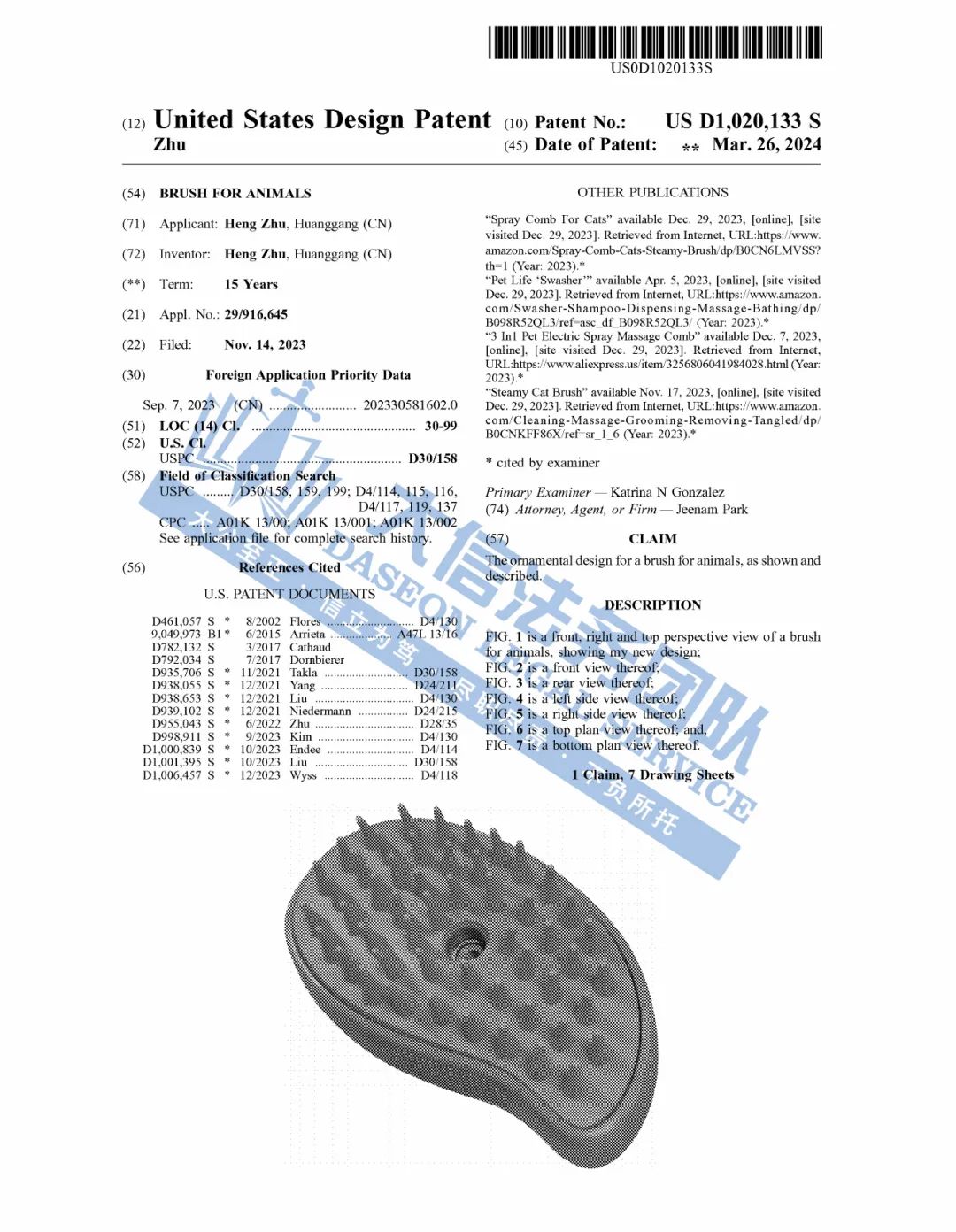 03 BRUSH FOR ANIMALS 动物刷子专利维权 案件号:24-cv-01809 立案时间:2024年10月4日 原告:Heng Zhu 代理律所:Dewittyip 原告介绍 原告是一位国人卖家,名下有一款宠物蒸汽刷Brushes for animals,此款产品采用脱毛、喷雾清洁和按摩三效合一设计,产品能有效去除松散毛发、缠结、打结、皮屑和污垢,而喷雾可以增强毛发水分,同时减少静电和散落的毛发,从而使毛发更干净。深受铲屎官们的青睐。