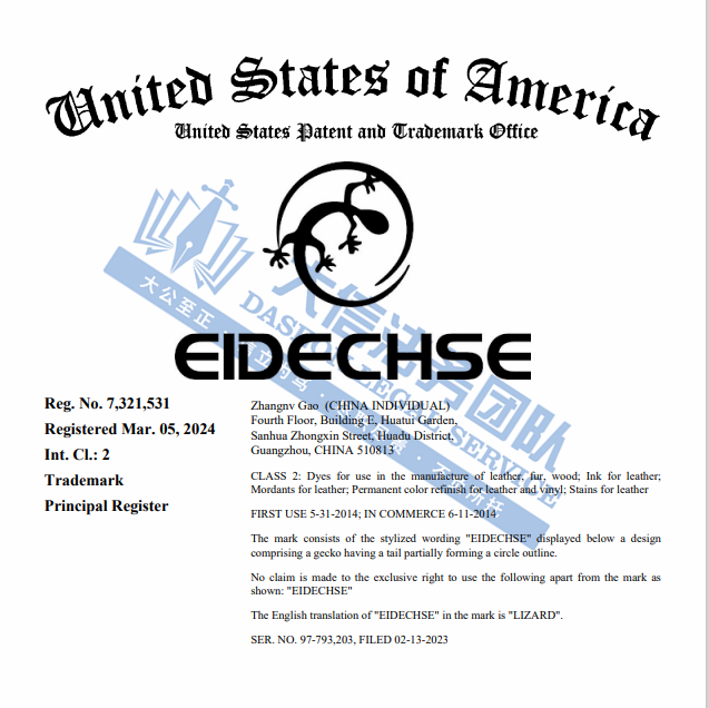案件分析 此案涉及“EIDECHSE”商标维权,商标注册在第 2 类:用于制造皮革、毛皮、木材的染料;皮革油墨;皮革染剂;皮革和乙烯基的永久性颜色修补剂;皮革染色剂。侵权风险极高!相关跨境卖家需格外注意规避侵权风险,及时自查! 产品展示
