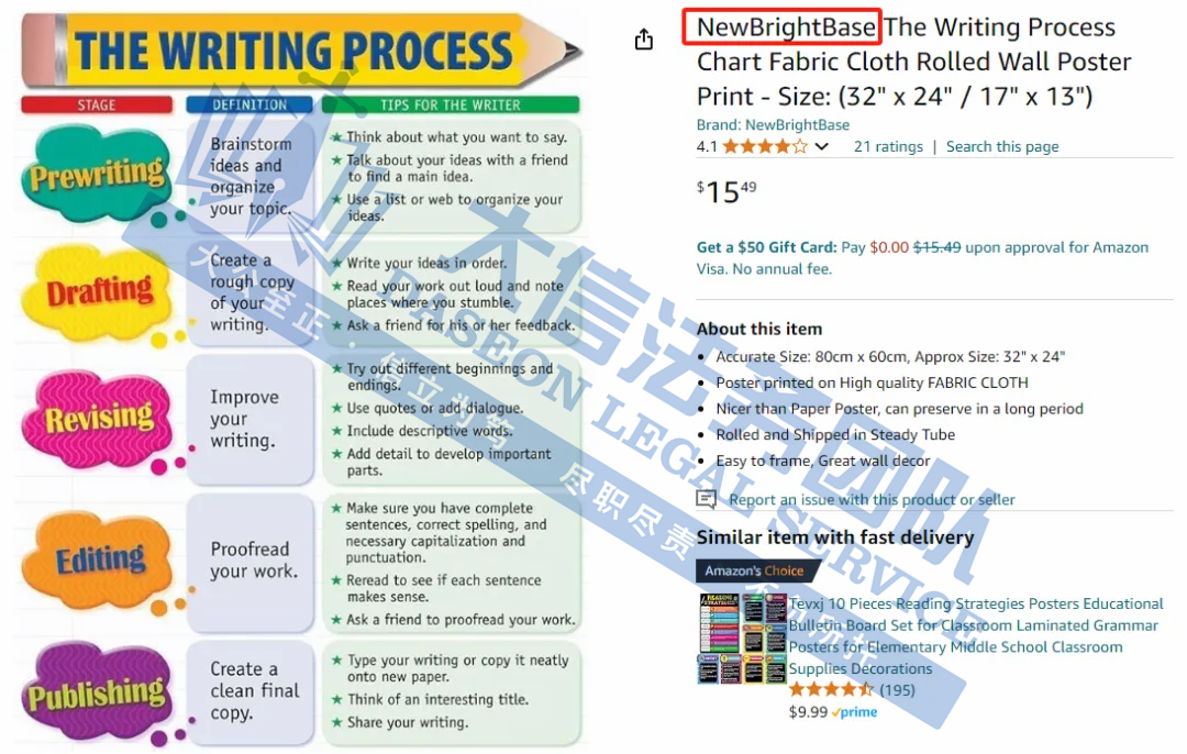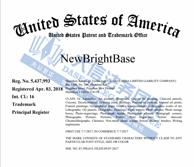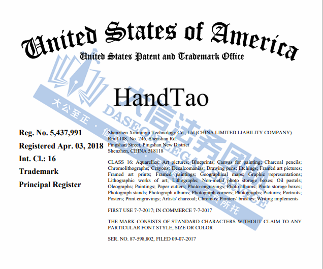 案件分析 此案目前处于密封状态,主要涉及在美国共注册NewBrightBase和HandTao两个商标,注册类目为第16大类,主要涉及水彩画;艺术图片;蓝图;绘画画布等领域。侵权风险极高!相关跨境卖家将尽快检索下架! 产品展示