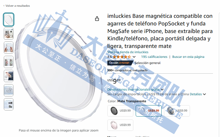 04 磁吸支架专利维权 案件号:24-cv-10814 立案时间:2024年10月18日 原告:Zhiwu Zheng 代理律所:Lance Liu 原告介绍 原告是一位国人卖家,该专利产品是一种用于手机支架的磁性底座,其核心功能是利用磁性来吸附手机。这种磁性吸附能力可以使手机在放置在底座上时更加稳固,不易滑落。适用于办公桌上、床头等方便观看手机内容,解放双手保持画面稳定,还可用于商业或个人展示手机相关内容。