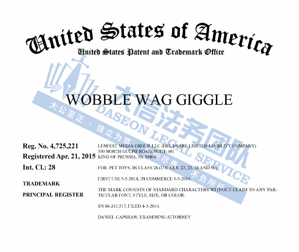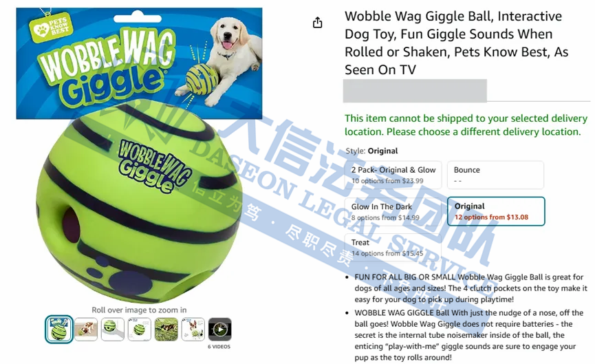 WOBBLE WAG GIGGLE狗狗摇笑球商标 案件号:24-cv-09484 立案时间:2024年10月4日 原告:ALLSTAR MARKETING GROUP, LLC 代理律所:Sullivan & Carter, LLP 原告介绍 原告是一间品牌营销公司,Wobble Wag Giggle 是一种为狗狗设计的互动玩具,能够在运动过程中发出有趣的声音,吸引狗狗的注意力并激励它们积极玩耍。玩具内部的独特构造使得它在滚动时会不规则地移动,同时发出声音,增加了狗狗的兴趣,也能帮助它们锻炼身体。Wobble Wag Giggle 不仅能够提供娱乐,还能帮助促进狗狗的身心健康。许多狗主人表示,他们的狗狗对这个玩具非常喜爱,能够有效缓解无聊和焦虑。