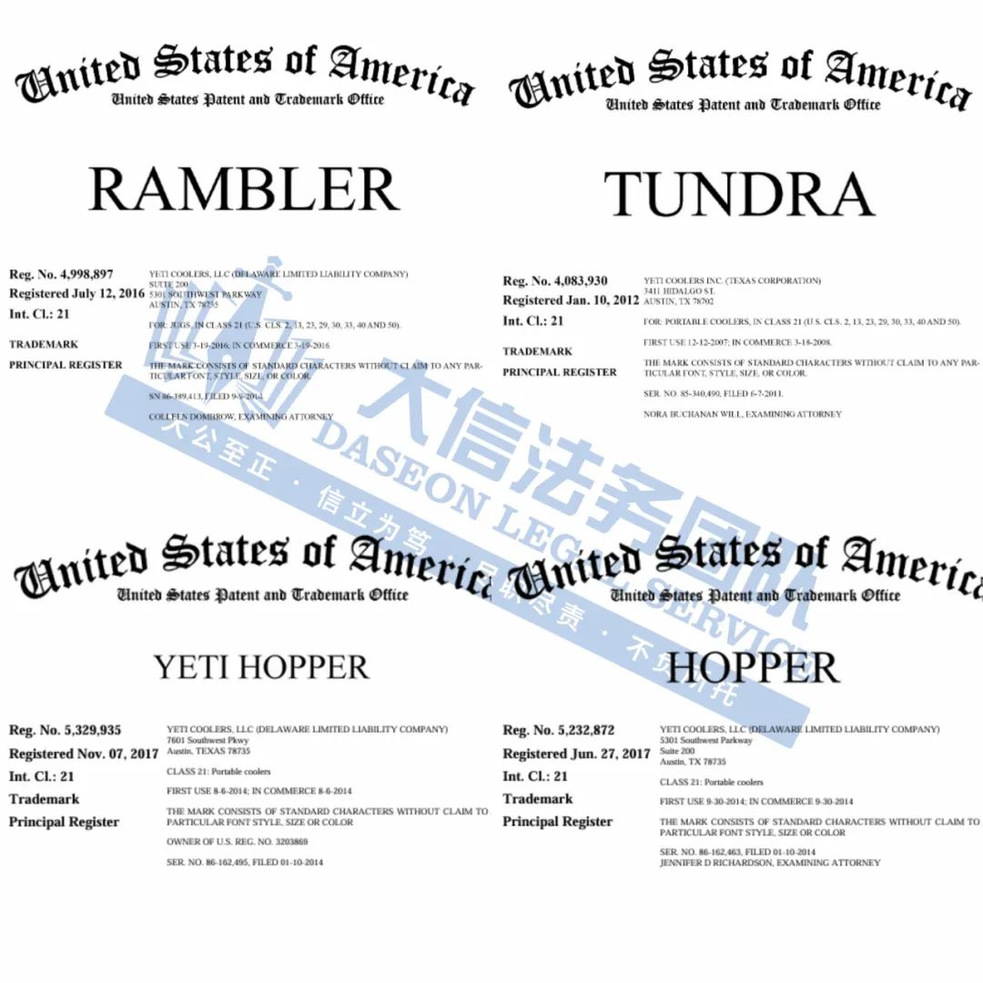 案件分析 此案涉及三个商标维权,注册大类包括办公用品(16类)、皮革皮具(18类)、服装鞋帽(25类)、纽扣拉链(26类)、健身器材(28类)和教育娱乐(41类)等多个品类!侵风险极高!卖家在选品是一定要注意,未经授权不得擅自使用! 产品展示 04 YETI商标维权 案件号:24-cv-62045 立案时间:2024年10月31日 原告:Yeti Coolers, LLC 代理律所:SMG 原告介绍 原告YETI Coolers, LLCETI是一家美国德克萨斯州的公司,成立于2006年,十多年来专注于冷却器的生产与销售,一种专为户外爱好者打造的可以承受在野外和水上等恶劣环境也不会收到损伤的产品,YETI一直是创新产品的领先制造商、设计师、开发商、零售商和分销商,包括便携式冷却器、饮料器皿、袋子和服装及其他产品。YETI最受欢迎的产品之一是它的YETI漫步者饮料器皿系列,由耐用的不锈钢与双壁真空绝缘,以保护热饮料和冷饮料。