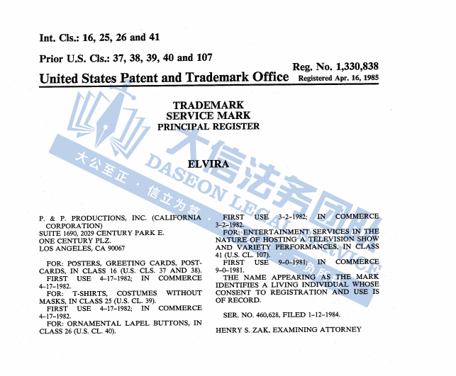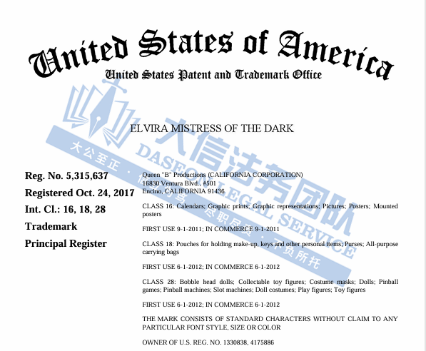 产品展示 03 暗黑喜剧电影黑暗情妇商标维权 案件号:24-cv-11225 立案时间:2024年10月31日 原告:Queen “B” Productions 代理律所:TME 原告介绍 原告Queen B Productions 是一家电影制作公司,由Amyana Bartley创立。Elvira: Mistress of the Dark(埃尔维拉:黑暗情妇)是该公司执导的一部出版于1988年的美国喜剧恐怖电影,讲述了女主Elvira她收到一远方小镇姑妈的来信,得知自己是姑妈遗产的继承人。Elvira欣喜若狂,幻想着继承的豪宅名车和大把现金,于是独自开车奔赴小镇。然而,在小镇上,她遇到了一系列诡异和恐怖的事件Elvira穿戴蓬松的假发,妆容以黑暗色系为主,黑色深V礼服以及黑丝高跟凸显了这个角色性感暴露的特点。由于Elvira: Mistress of the Dark 收到了了褒贬不一的评家,因此饰演Elvira的Peterson获得土星奖最佳女主角和拉齐奖最差女演员提名。
