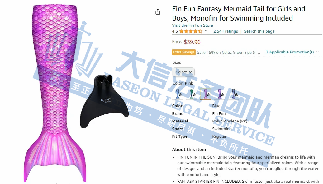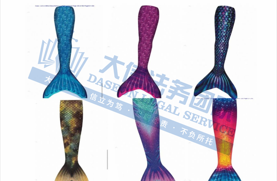 案件分析 此案涉及版权维权,版权注册号为VaU 1-517-249,此案共涉及了195家店铺,由于版权图片还未公开,以下产品图片可供卖家参考,尽快对比下架!否则会造成侵权损失! 产品展示 02 FIN FUN美人鱼尾巴版权+商标+专利 案件号:24-cv-24197 立案时间:2024年10月28日 原告:FIN FUN 美人鱼 代理律所:Boies Schiller Flexner LLP 原告介绍 原告Fin Fun是美国的游泳用品品牌,其销售的主要产品有美人鱼尾巴、鱼鳍、泳衣、鱼翅和其他游泳配件。在2009年,Karen and Jerry Browning的孙女受到迪士尼童话中小美人鱼的启发,多次央求拥有50余年裁缝经验的奶奶为她量身打造一条美人鱼尾巴。这个设计一经亮相,便大受好评,Fin Fun美人鱼尾巴的设计独具匠心,醒目且充满活力的色彩,以及逼真的3D鱼鳞纹理,使其在水中游动时更加耀眼夺目。其侧翼和尾部的独特造型不仅让游泳速度更快,更让女孩们可以在水中摇曳生姿,仿佛真的化身为了那条迷人的美人鱼!