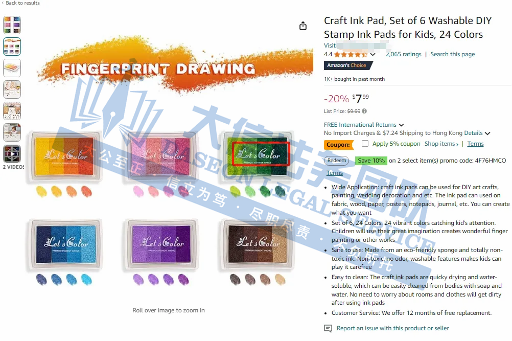 案件分析 此案涉及商标维权,原告旗下商标特别多,涉及范围广泛,此次连发3案,可见侵权风险极高!相关跨境卖家未经授权不得擅自使用! 产品展示 04 LET'S COLOR 印台 案件号:24-cv-62059 立案时间:2024年11月1日 原告:Logaro LLC 代理律所:Heitner Legal, P.L.L.C. 原告介绍 原告是专为手工艺爱好者和儿童设计,具有广泛的应用场景。采用环保海绵和无毒墨水制成,无毒无味且可水洗,让孩子们可以安心使用。印台干得快,且为水溶性,用肥皂和水即可轻松清洗,避免弄脏房间和衣物。这款印台适用于 DIY 艺术创作、绘画、婚礼装饰等项目,能在布料、木材、纸张、海报、笔记本等多种材质上进行创作,让用户尽情发挥想象力。特别适合吸引儿童的注意力,激发他们的创意潜力,用于手绘等作品创作。