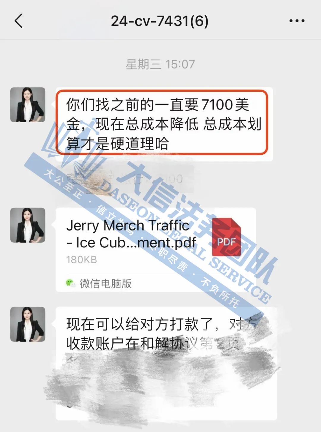 案件详情 案件号:24-cv-07431 立案时间:2024年8月19日 原告:Merch Traffic, LLC 代理律所:GBC 大信团队处理过程 近日,有客户收到GBC代理的美国说唱歌手Ice Cube商标TRO 邮件【24-cv-07431】 导致客户亚马逊平台账户的近9000美金惨遭冻结 客户找其他服务商处理,最低只能7100美金和解 客户不满意,于是找到我们大信团队 客户选择委托我们,就表示客户信任我们大信团队作为后盾 所以,接受委托之后,我们迅速于卖家沟通,大信团队也深入分析案件情况,制定并实施具有针对性的谈判策略 当晚与对方进行激烈交涉。 随后对方报价5500美金和解,但我方律师并没有满足与此,继续乘胜追击,深入挖掘案件细节,寻找更多谈判空间 经过多轮谈判,最终再次成功压价,对方全面同意我方和解条件,再次为客户节省1000美金 成功4500美金和解,拿回2个店铺! 目前,该卖家已经顺利签署和解书,我们也将持续跟进后续事宜,直至卖家店铺资金解冻! 此次案件只是大信团队成功解决二次处理疑难案例之一 也是想鼓励所有跨境卖家在遭受TRO时,不要恐慌,选择专业、高效的律师团队,采取明智的和解策略,就能帮助您迅速恢复店铺,并极大减少经济损失。 如果你收到了TRO,莫慌张,来找大信,大信团队致力于为中国跨境电商卖家们保驾护航! 今天就分享到这里了,感谢你的阅读。大信团队会持续为你带来最新的侵权咨询。想要了解更多内容,可关注我们【大信团队】。 我们始终坚信,法律服务没有捷径,容不得任何滥竽充数的行为。大信法务团队有中美资深律师,在美国TRO诉讼行业深耕多年,处理过上万起TRO侵权案,致力于为中国跨境电商卖家保驾护航! 如果有关于店铺大额资金冻结、同行解决不了、缺席判决、多次谈判博弈无法和解的案子可以添加我们联系方式,我们将为你提供最优质的法律服务。