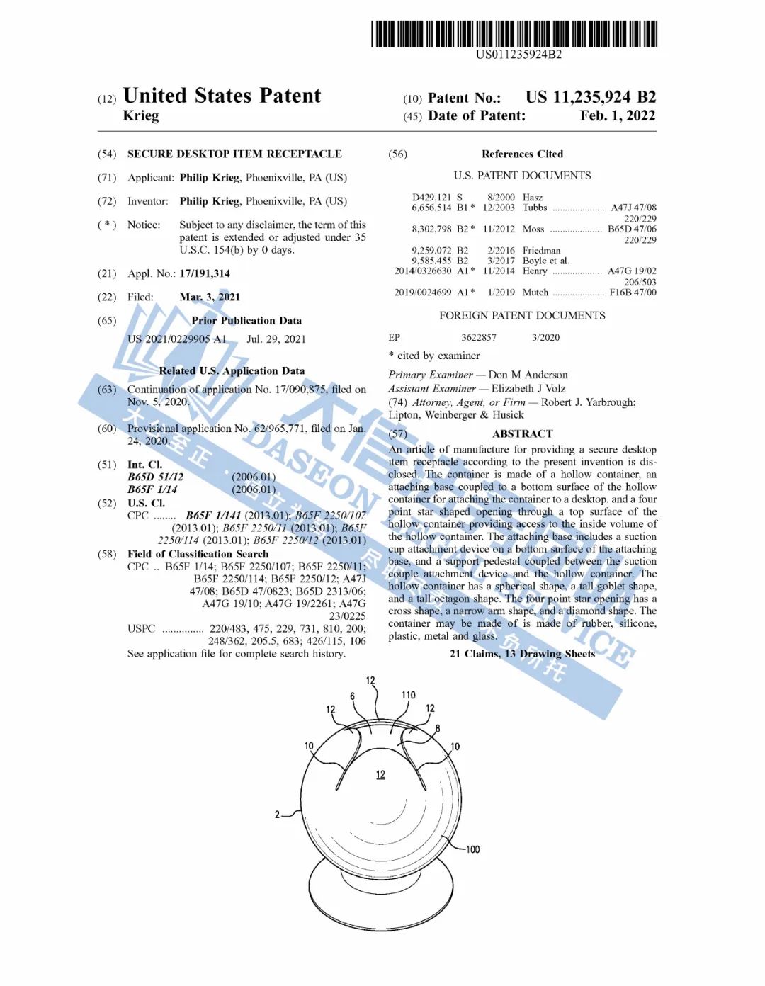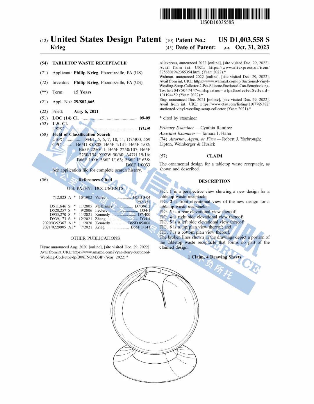案件分析 此案为专利维权,涉及一项美国外观设计专利,于今年7月份下证,专利号:USD1035306S;值得注意的是,专利为外观专利,只要外观相似,都有侵权风险,跨境买家尽快检索下架! 产品展示 04 桌面垃圾收集器专利维权 案件号:24-cv-11524 立案时间:2024年11月8日 原告:Philip Krieg 代理律所:Bishop Diehl & Lee, Ltd. 原告介绍 原告Philip Krieg名下有一家IVYNE的店铺,店铺主要销售收工制作工具和技巧教程,此次维权的是一款圆乎乎的球形桌面碎片收集容器,该产品拥有比一般收集器更大的容纳空间,减少频繁清理的麻烦,提升工作连贯性。该设计通过顶部的曲线槽和叶片状结构,形成一个中心开口,既美观又实用。它的底部装有吸盘,可以将容器稳固地固定在桌面或其他平面上,防止意外移动或倾倒,适合在办公环境或家中使用,便于安全放置杂物或废弃物。