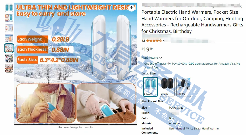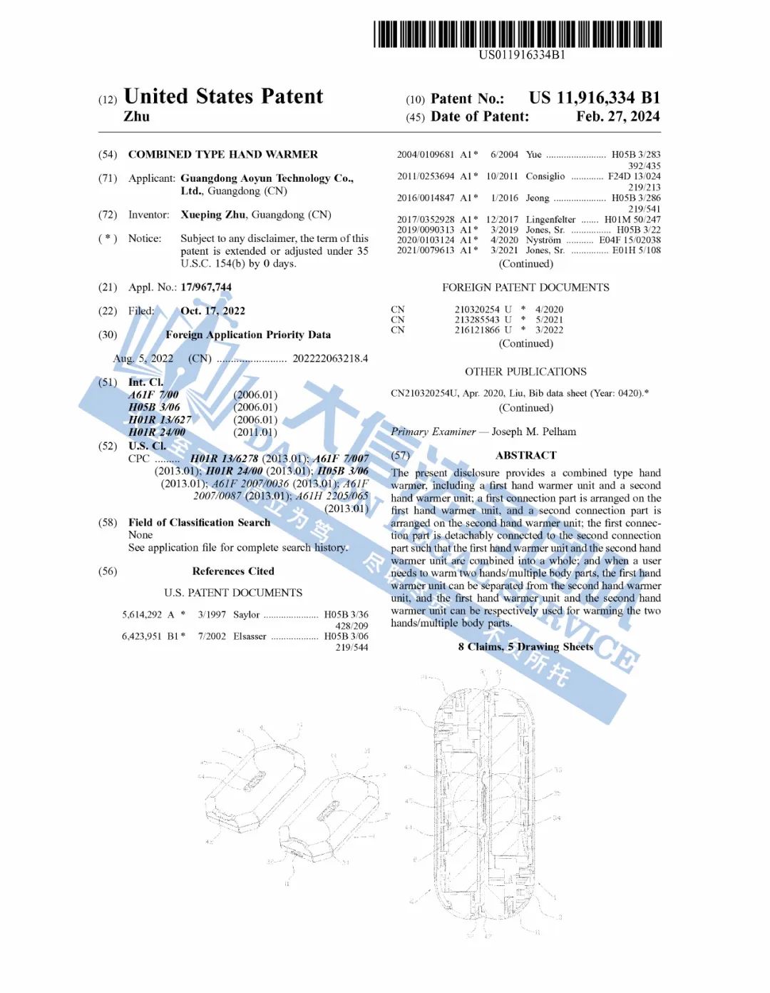 产品展示 02 组合式暖手宝发明专利维权 案件号:24-cv-11570 立案时间:2024年11月10日 原告:Guangdong Aoyun Technology Co Ltd. 代理律所:Palmer Law Group, P.A. 原告介绍 原告是我国企业,公司成立于2022年,主营暖手器、小风扇、便携式储能、汽车跳车启动器、吹叶机,涉案产品是一款创新设计的取暖设备,专为满足用户双手或多部位同时取暖的需求而设计。通过磁性设计实现双单元组合的方式,为用户提供更灵活的加热体验。每个暖手单元可独立加热,适合单手或双手使用。三档温度调节和快速加热功能确保用户在寒冷的冬季中享受到持续、稳定的温暖体验。通过 UL、CE 和 FCC 认证,支持快充,非常适合冬季取暖和各种旅行和活动。