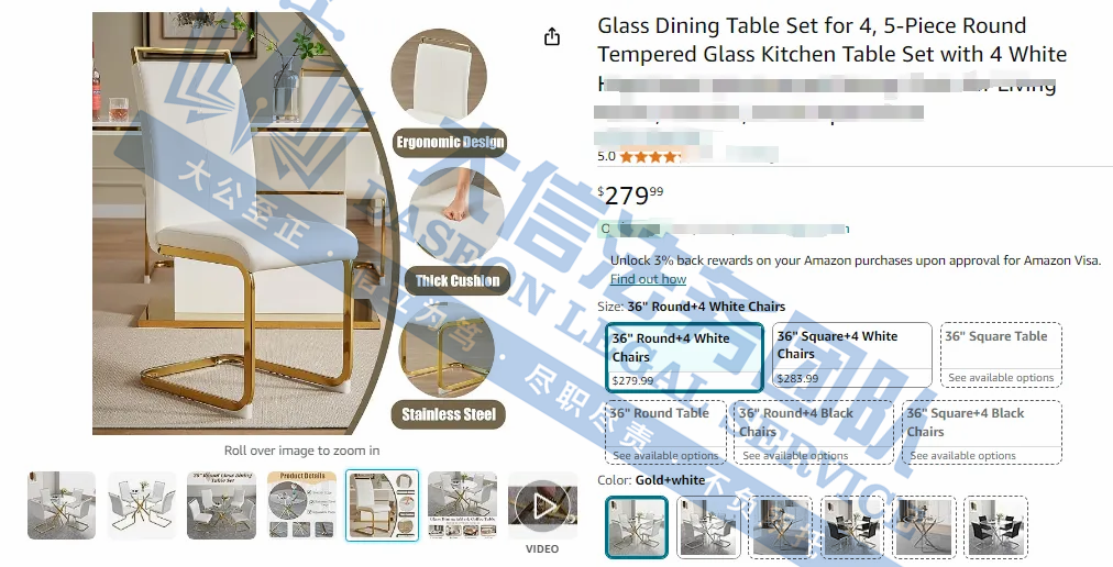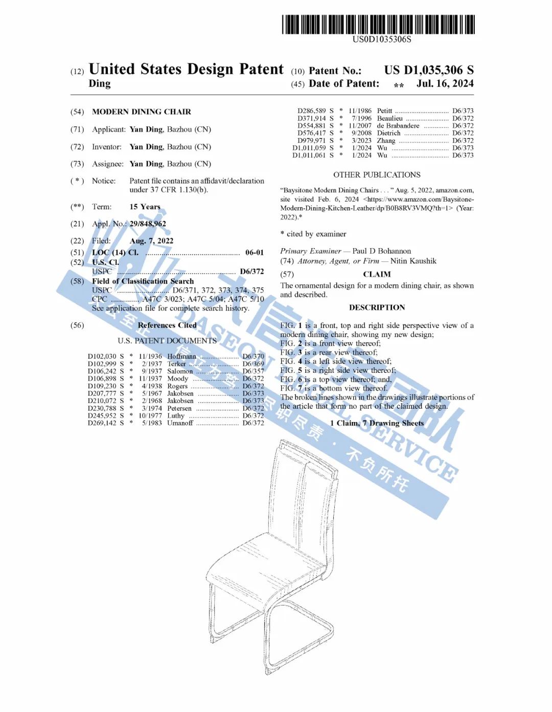 03 现代餐椅专利维权 案件号:24-cv-11528 立案时间:2024年11月8日 原告:Yan Ding 代理律所:Aptum Law 原告介绍 原告是国人卖家,名下有一款餐椅外观专利,这款餐椅的C型不锈钢框架不仅增强了整体的支撑性,也让椅子更具稳定性,每张椅子的承重可达300磅,确保坚固耐用。椅子填充了高密度海绵,提供出色的舒适感,并易于清洁。这款餐椅还通过巧妙的形状和比例搭配,不仅提升视觉吸引力,还符合人体工学,更加舒适实用。