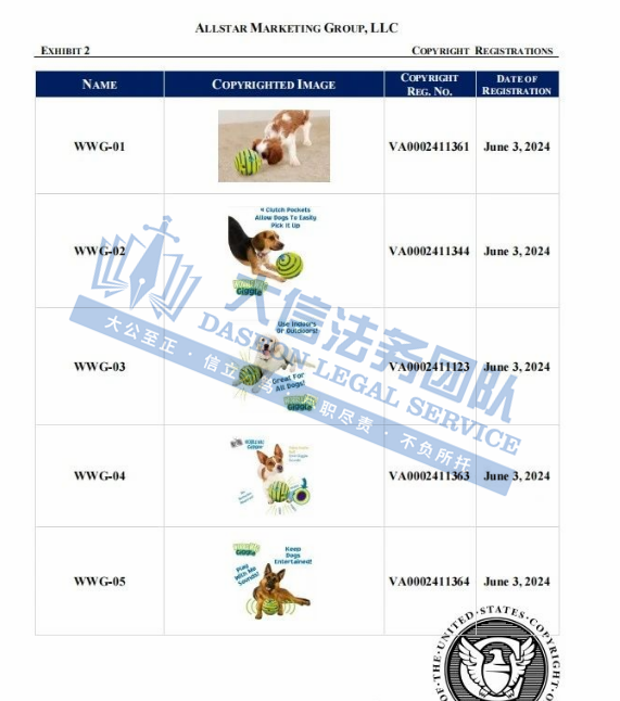 案件分析 此案为版权维权,维权的Mind Games of Ozzy戴眼镜的猫这幅作品,于2023年10月获得美国版权证书,版权号为VA2375137,原告曾多次维权,共冻结了528个跨境店铺!时隔半年多,keith律所针对该版权再次维权,相关跨境卖家尽快检索下架! 产品展示 02 WOBBLE WAG GIGGLE狗狗摇笑球商标+版权 案件号:24-cv-09484 立案时间:2024年10月4日 原告:Allstar Marketing Group, LLC 代理律所: Sullivan & Carter LLP 原告介绍 原告是一家品牌营销公司,Wobble Wag Giggle是该公司旗下的一款专为狗狗设计的互动玩具球,内部的独特构造使得它在滚动时会不规则地移动,并在运动过程中发出有趣的声音,吸引狗狗的注意力并激励它们玩耍。不仅能够提供娱乐,还能帮助促进狗狗的身心健康,有效缓解狗狗的无聊和焦虑。由于产品的独特性和实用性,Wobble Wag Giggle在市场上广受欢迎,成为许多狗狗主人的首选玩具。