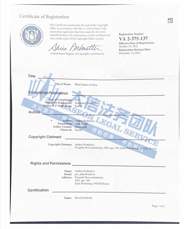 01 眼镜猫版权维权 案件号:24-cv-11600 立案时间:2024年11月11日 原告:Andrey Prokhorov 代理律所:Keith 原告介绍 原告是一位具有丰富职业生涯和卓越艺术成就的摄影师和肖像画家,以其独特的视角和精湛的技艺在摄影界崭露头角。他的大部分原创作品都是黑白的,因为这样可以通过操纵光影来提供更多用光作画的机会,这种独特的风格使得他的作品更加引人入胜。Mind Games of Ozzy这幅描绘一只戴眼镜的猫的画作,是Andrey Prokhorov于2011年创作完成的,面世即引起了轰动,还成为纽约市一场爵士音乐节的标志,甚至在王子的音乐会中出现。