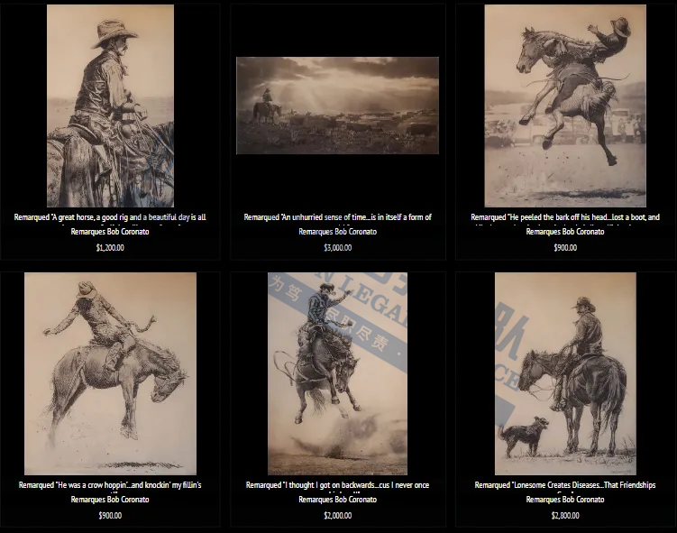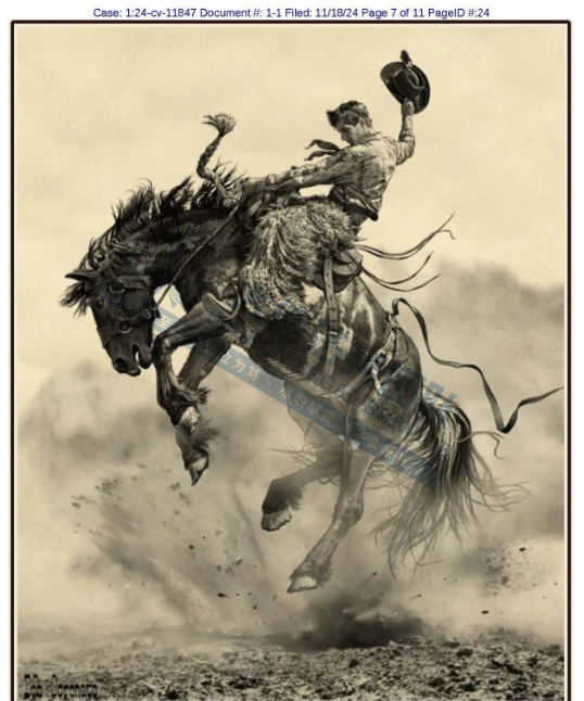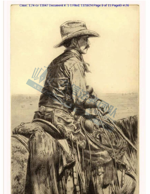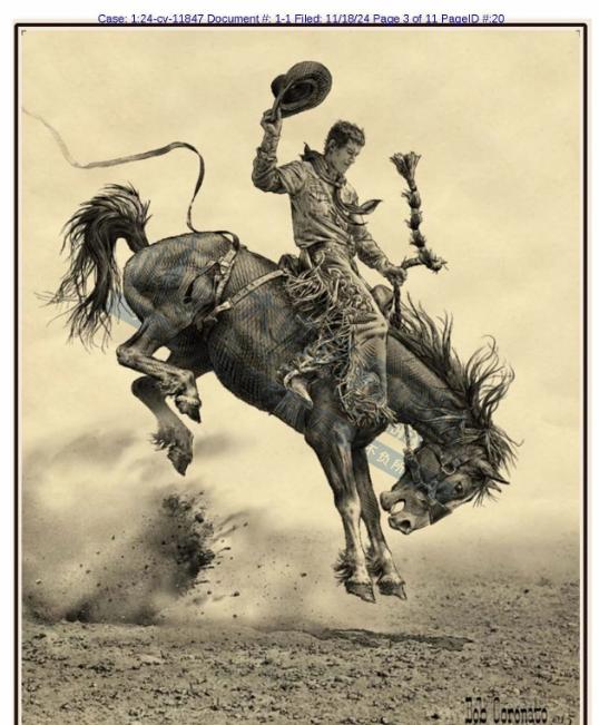 产品展示 04 Robert M. Coronato 西部牛仔版权画 案件号:24-cv-11847 立案时间:2024年11月18日 原告:Robert M. Coronato 代理律所:Keith 原告介绍 原告是一位才华横溢的牛仔艺术家,毕业于洛杉矶著名的奥蒂斯/帕森斯美术学院。他的艺术创作深受传统牛仔生活方式的启发,通过画笔,记录下那些正在消逝的西部生活瞬间,展现了人们对自由与广阔的向往。他的作品主题鲜明,充满力量,提醒着人们那个遥远而自由的西部仍然存在,只是躲藏在我们国家的一小片角落里。作品将牛仔、印第安人和西部景观相结合,既传承传统又融入现代元素,具有独特的艺术魅力,是西部文化艺术的重要代表之一。