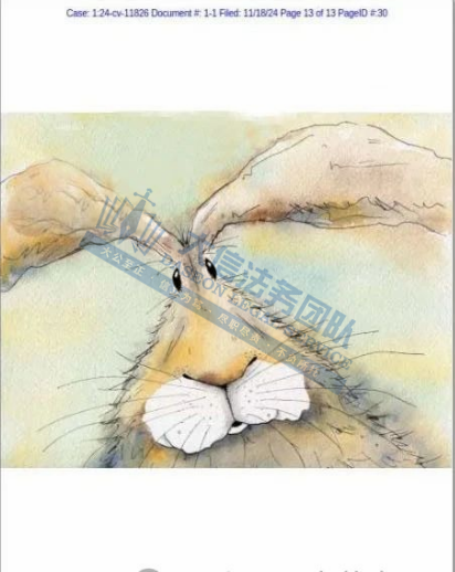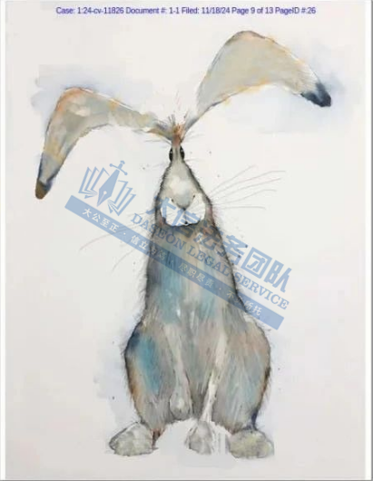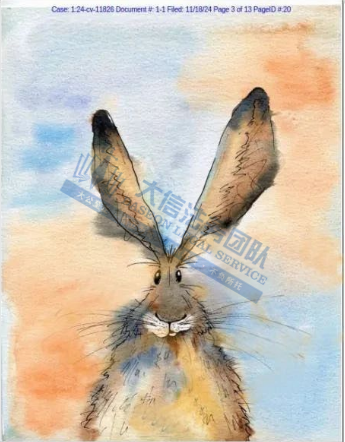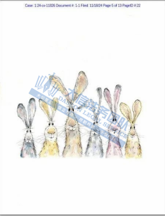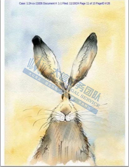 产品展示 03 Rebecca Fielding兔子版权画 案件号:24-cv-11826 立案时间:2024年11月18日 原告:Rebecca Fielding 代理律所:Keith 原告介绍 原告是一位英国艺术家,她擅长运用水彩与水墨技法,不仅精准捕捉这些动物的身体特征,更巧妙地在作品中注入了一种古怪而鲜明的个性色彩,展现了自然与动物的和谐之美。除了动物画,她还涉足插画和动画领域,展现了广泛的艺术技能和创意。作为布里斯托大学动画专业的毕业生,她的艺术作品融合了设计与视觉沟通的多元风格,既富趣味性又极具观赏价值。深受观众喜爱。