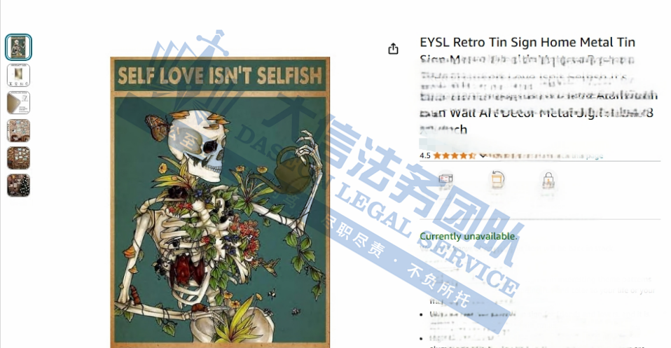案件分析 此案为匿名维权案件,涉及一张骷髅与植物学版权维权,版权号为:Vau 1-419- 816,相关卖家尽快检索下架!避免造成更大的侵权损失! 案情进展