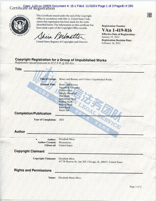 产品展示 02 Elizabeth Moss骷髅插画 案件号:24-cv-10825 立案时间:2024年10月21日 原告:Elizabeth Moss 代理律所:David 原告介绍 原告是一位才华横溢的自由插画家,专注于科学插画领域。Elizabeth Moss的作品集广泛涵盖了传统媒体与数字媒体,展现了其在不同媒介上的卓越才能。其作品不仅被出版于各类出版物中,还出现在专辑封面及T恤设计上,体现了其在商业与艺术领域的双重成就。Elizabeth Moss的骷髅与植物学作品,是为Alphabet Rock画廊的展览而作,通过细腻的墨水和记号笔、以及丰富的彩色铅笔笔触展现出其独特的艺术风格和深刻的主题思考。