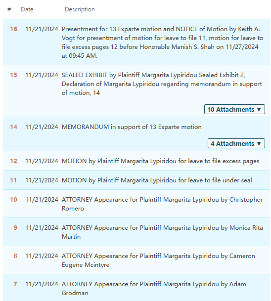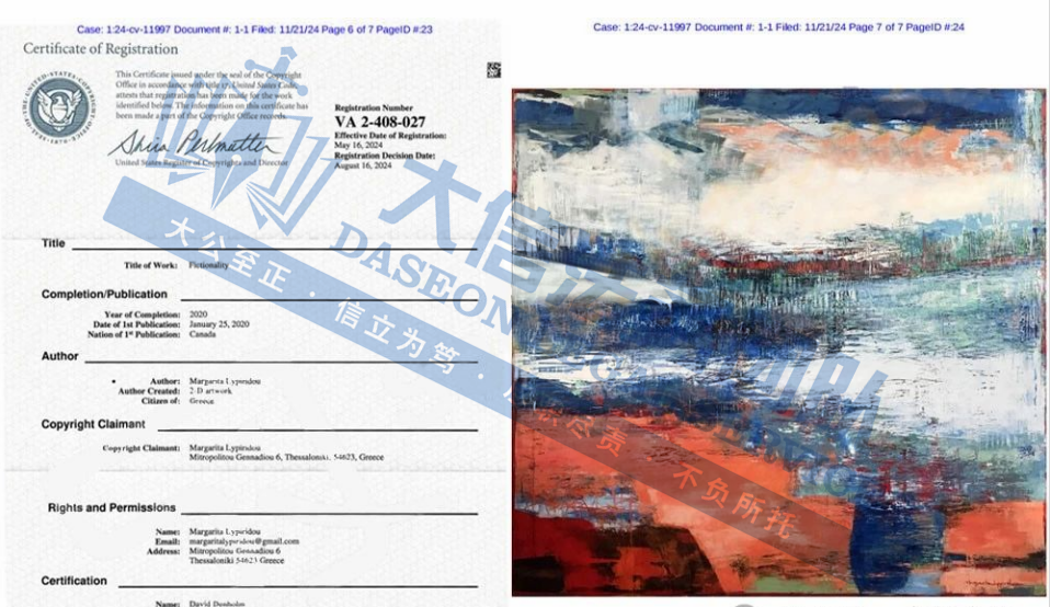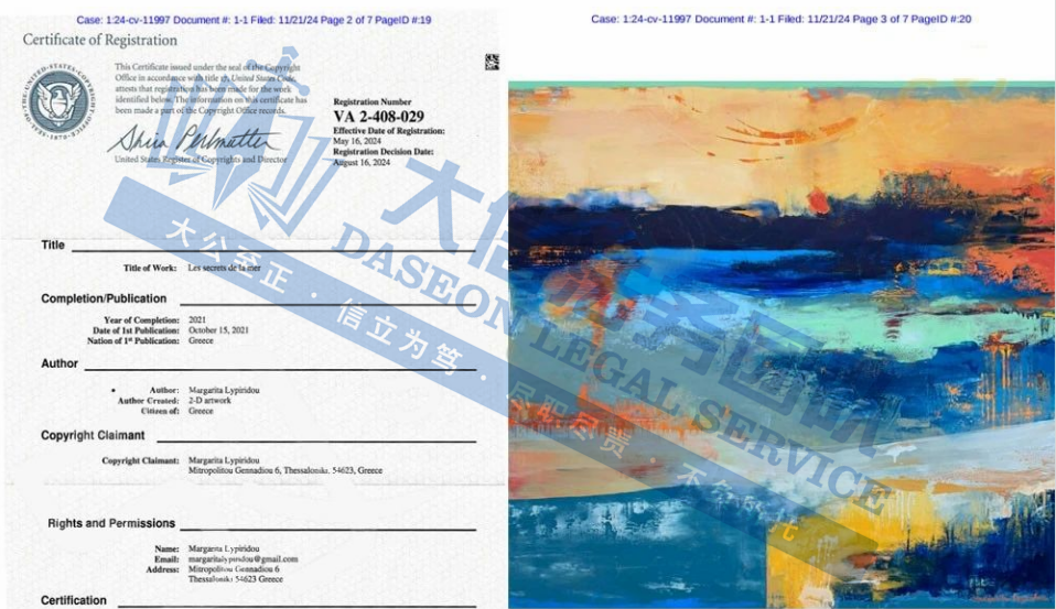 案件分析 此案是匿名维权案件,涉及Sock Slider商标和16张版权维权,目前已经冻结248家店铺,涉案的卖家尽快联系相关律师解决,其他卖家也要检索自家产品,避免侵权造成更大的损失!也可以联系我们提供免费法律咨询。 案情进展 产品展示 02 Margarita Lypiridou版权图 案件号:24-cv-11997 立案时间:2024年11月21日 原告:Margarita Lypiridou 代理律所:Keith 原告介绍 原告是一位来自加拿大的视觉艺术家、画家及版画艺术家。她创作了半抽象的混合媒体艺术作品,探索了短暂性、人类体验的流动性和自然的复杂性等主题。无论是绘画人物还是风景,她的目标都是表达存在感,创造一个叙事空间,以便探索运动和节奏。她运用丙烯酸、油、蜡等多种材料和技术,层层叠加,于纹理、色彩与图案间搭建起一场视觉对话,不断揭示又隐藏画面的不同层面,引导观众聚焦于画中特定之处,并依据各自的生活经验对作品进行个性化解读与反应,受到了广泛的关注和赞誉。
