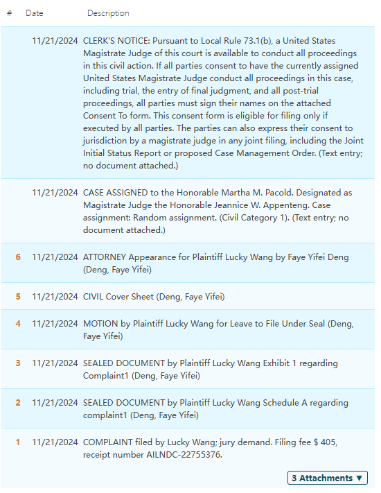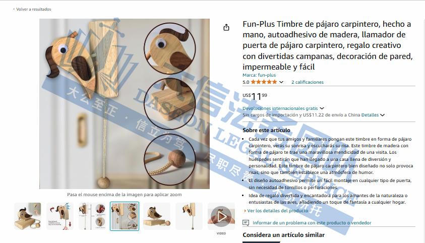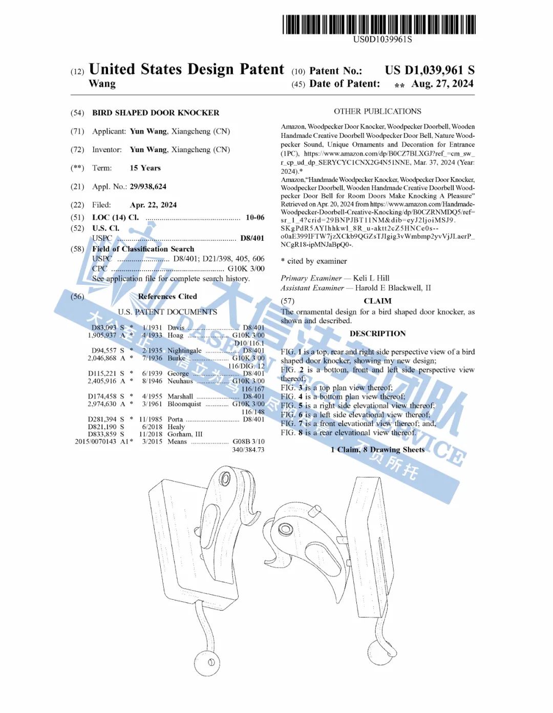 案件分析 此案涉及版权维权,版权号分别为:VA 2-408-029、VA 2-408-028和VA2-408-027,该版权均于2024年8月下证。旺季来临,卖家选品时一定要注意避开,否则会有侵权风险! 案情进展 产品展示 03 啄木鸟门铃专利维权 案件号:24-cv-11983 立案时间:2024年11月21日 原告:Lucky Wang 代理律所:Yk Law LLP 原告介绍 原告是国人卖家,旗下有一款木质啄木鸟门铃,采用木质材料制作,整体造型为一只精巧的啄木鸟。其发声原理与木鱼相似,通过弹簧固定小鸟,绳子拉扯让“啄木鸟”的嘴巴啄木撞击表面,放开绳索“啄木鸟”就会弹回原位,通过不断拉动绳索,就能发出“哒哒”的声音。主体部分由天然木材制成,环保且耐用;其设计精巧,立体感十足,能够增添家居的童趣和创意氛围。木材的纹理和色泽使得门铃更加自然、质朴,符合现代人对绿色、环保生活方式的追求。