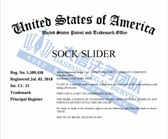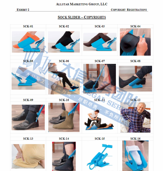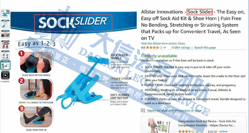 GBC作为业内起诉TRO第一大所,代理知名大牌较多,门槛和解金3000美金 但可以接受组团和解,如果收到GBC的TRO律师函,欢迎联系我们!! GBC正在组团的案件 (24-cv-8188)戴森卷发棒、(24-cv-06796)小猪佩奇和睡衣小英雄、(24-cv-9883)Smashing Pumpkins 乐队、(24-cv-10799)NIKE、(24-cv-11014)General Motors LLC 通用汽车、(24-cv-11002)Hallmark 贺曼商标、(24-cv-10911)英国摇滚乐队Fleetwood Mac商标、(24-cv-11392/11425/11419)Bounce Curl梳子专利 以上案件中招卖家在寻找团友,还未处理的可以联系大信团队! 如果不幸收到TRO邮件,面临账户资金被TRO冻结的困境? 别担心,我们大信团队也可进行清空返款服务 从案件评估、策略制定,到和解谈判、法律诉讼,我们全程陪伴,助您顺利解冻账户资金,并争取最大利益返还! 01 Sock Slider穿袜辅助器版权+商标 案件号:24-cv-10491 立案时间:2024年10月16日 原告:Allstar Marketing Group, LLC 代理律所:Sullivan & Carter LLP 原告介绍 原告是一间营销公司,这次为旗下“SOCK SLIDER”产品维权。Sock Slider穿袜辅助器是一种专为无法弯腰、坐姿不稳、双手碰不到脚或手部功能受限的人群设计的辅助工具,能够帮助他们轻松穿上袜子,提高生活的自主性和独立性。穿袜辅助器通过机械结构将袜子撑开并固定在辅助器上,用户只需将脚伸入辅助器中,通过拉动或调整辅助器的某些部件,即可将袜子穿到脚上。适用于许多年长者、关节炎患者、双手碰不到脚或手部功能受限的肢体残障人士等。