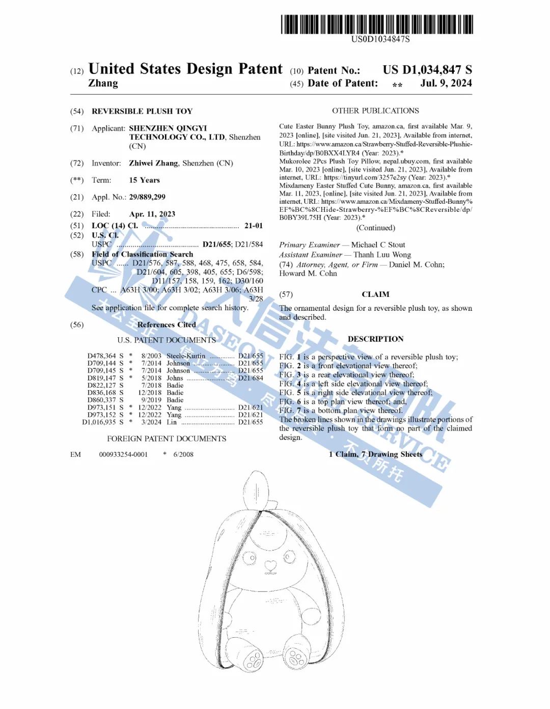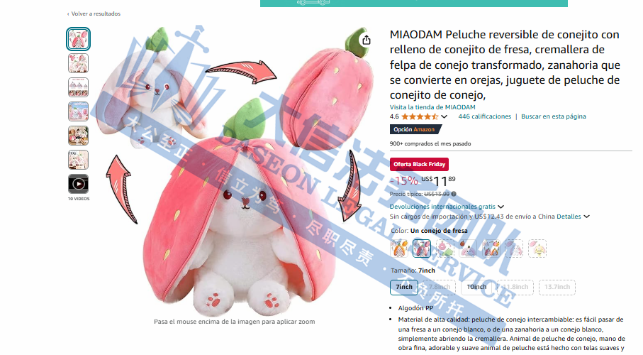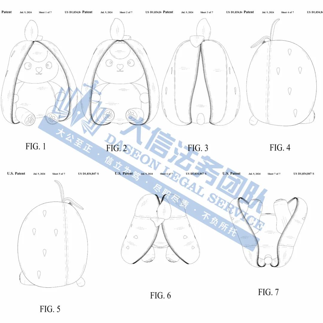 案件分析 此案是一起匿名维权案件,该公司在美国仅注册了RYZE SUPERFOODS商标,于2024年6月下证。目前涉案账户资金已被TRO冻结,涉案卖家尽快处理,避免早成更大的损失! 案情进展 产品展示 03 可翻转毛绒玩具专利维权 案件号:24-cv-11693 立案时间:2024年11月14日 原告:Shenzhen Qinyi Technologies Co., Ltd. 代理律所:Yk Law LLP 原告介绍 原告是国人卖家,旗下有一款可翻转成大耳朵兔子的草莓毛绒玩具,巧妙结合了草莓与兔子的元素,只需简单翻转与拉链操作,即可从一颗草莓变身成为拥有大耳朵的可爱兔子。草莓兔采用高品质羽绒PP棉填充,使得玩具手感柔软轻盈,蓬松而有弹性,亲肤透气。其毛绒细腻且耐用,不易脱落或变形,让孩子能放心玩耍,无需担心拉扯撕裂。既实用又充满趣味,是送给小朋友或作为家居装饰的绝佳选择。