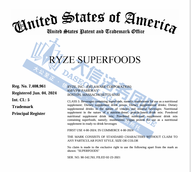 02 RYZE蘑菇咖啡商标 案件号:24-cv-11455 立案时间:2024年11月6日 原告:RYZE, Inc 代理律所:Saper Law Offices, LLC 原告介绍 原告是一家总部位于波士顿的食品公司,从事研发、制造、销售和分销高质量的膳食补充剂饮料混合物,包括蘑菇基咖啡和抹茶产品等,目前该公司的核心产品蘑菇咖啡中融入了六种重要的药用菌,包括冬虫夏草、猴头菇、灵芝、香菇、云芝和杏鲍菇。这些成分的选择旨在为消费者提供全面的健康支持。与传统咖啡相比,蘑菇咖啡具有更低的咖啡因含量,能够自然地提高注意力和能量,而不会带来焦虑、胃部不适和睡眠不规律等负面影响。这些药用菌还为免疫系统、消化系统、大脑和心脏健康提供额外的益处。蘑菇咖啡自推出以来,在市场上获得了广泛的关注和好评。