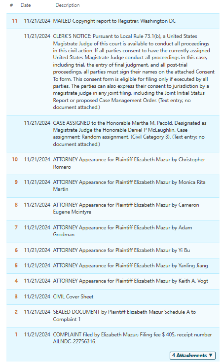 案件分析 此案是11月中旬的匿名维权案件,该专利于2024年7月在美国下证,专利号:D1034847S,在亚马逊平台销量超多,各位跨境卖家速速排查下架,否则会有TRO侵权风险! 案情进展 产品展示 04 Elizabeth Mazur版权图 案件号:24-cv-11989 立案时间:2024年11月21日 原告:Elizabeth Mazur 代理律所:Keith 原告介绍 原告是一位来自多伦多的艺术家,作为一名全职艺术家和插画家,她善于运用钢笔和墨水创作,同时也擅长利用数字技术为作品上色并绘制壁画。她的作品常常展现出对自然美和人类想象力的独特探索,她以视觉艺术、诗歌、壁画和表演为媒介,传达出深刻的情感和思想。引导人们去探索自然界最奇妙的角落,如浩渺的星空、深邃的海洋、变幻莫测的天空以及森林的神秘气息。作品不仅在艺术领域受到认可,也在跨界合作中展现出独特的魅力。