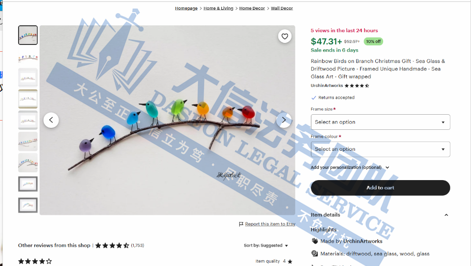 案件分析 此案涉及商标和版权维权,分别于2022年8月下证的Lil Sweety文字商标,和2024年8月下证的多张美国版权。目前已申请TRO冻结,未经授权不得擅自使用,侵权风险极高!相关跨境卖家尽快检索下架! 案情进展 产品展示 02 海玻璃彩虹鸟版权 案件号:24-cv-12169 立案时间:2024年11月25日 原告:Sophie Kirkpatrick 代理律所:David 原告介绍 原告是一位来自英国的艺术家,她的作品巧妙地将雕塑与自然元素以及丰富的色彩相结合,创造出引人入胜且富有深意的艺术作品。她深受海滩的启发,将海玻璃、海滩鹅卵石和浮木等自然材料巧妙地融入她的作品中,将看似平凡的石头转化为精美的艺术品。在2021年,Sophie决定将自己的创作分享给更广泛的观众,于是在Etsy上开设了自己的店铺。她的店铺迅速吸引了许多顾客,大家都被她作品中蕴含的自然之美和手工艺的精湛所吸引。