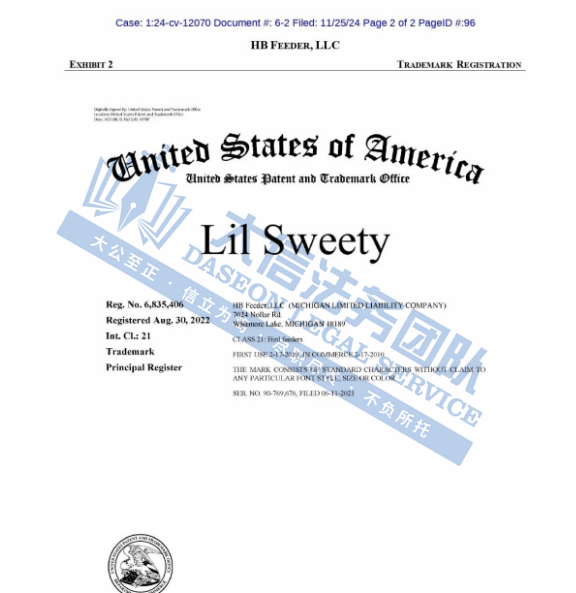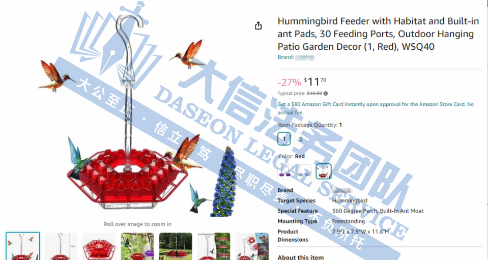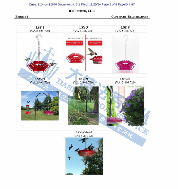 但可以接受组团和解,如果收到GBC的TRO律师函,欢迎联系我们!! GBC正在组团的案件 (24-cv-8188)戴森卷发棒、(24-cv-06796)小猪佩奇和睡衣小英雄、(24-cv-9883)Smashing Pumpkins 乐队、(24-cv-10799)NIKE、(24-cv-11014)General Motors LLC 通用汽车、(24-cv-11002)Hallmark 贺曼商标、(24-cv-10911)英国摇滚乐队Fleetwood Mac商标、(24-cv-11392/11425/11419)Bounce Curl梳子专利 以上案件中招卖家在寻找团友,还未处理的可以联系大信团队! 我们深知,每一位创作者和企业都希望他们的智慧成果得到尊重和保护。因此,我们提供全面的侵权投诉服务,帮助您迅速应对侵权行为,维护您的合法权益。 如果不幸收到TRO邮件,面临账户资金被TRO冻结的困境? 我们也提供深入的不侵权分析,确保您的产品和创意在法律框架内安全航行,避免不必要的法律风险。 同时,我们大信团队也可进行清空返款服务 从案件评估、策略制定,到和解谈判、法律诉讼,我们全程陪伴,助您顺利解冻账户资金,并争取最大利益返还! 01 蜂鸟喂食器 案件号:24-cv-12070 立案时间:2024年11月22日 原告:HB Feeder, LLC 代理律所:Sullivan & Carter, LLP 原告介绍 原告是一家专注于蜂鸟喂食器及相关配件的研发、制造与分销的创新型企业。Lil Sweety Feeder是一款蜂鸟喂食器,采用六边形设计,表面镶嵌着六边形钻石行形状喂食孔,中央配备有亚克力挂钩,便于悬挂。并配备了多达30个喂食口,形似绽放的花朵,拥有超过200个精细刻面,在阳光照耀下如同钻石般熠熠生辉,有效吸引蜂鸟前来觅食。独特的灌装系统简化了操作流程,用户只需将糖和水倒入预设的液位线,无需额外测量,即可轻松完成花蜜的配置。无论是使用一壶花蜜进行填充,还是在外出时快速补充,只需轻轻提起盖子,倒入花蜜即可,极大提升了使用的便捷性。