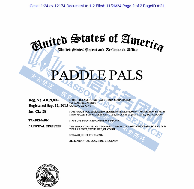 案件分析 此案是商标和版权双重维权,涉及原告旗下美国专利,于2015年12月1日下证,专利号:US D744,603 S,商标关键词:PADDLE PALS,相关跨境卖家尽快检索下架!避免造成侵权损失! 案情进展 产品展示 今天就分享到这里了,感谢你的阅读。大信团队会持续为你带来最新的侵权咨询。想要了解更多内容,可关注我们【大信团队】。 我们始终坚信,法律服务没有捷径,容不得任何滥竽充数的行为。大信法务团队有中美资深律师,在美国TRO诉讼行业深耕多年,处理过上万起TRO侵权案,致力于为中国跨境电商卖家保驾护航! 如果有关于店铺大额资金冻结、同行解决不了、缺席判决、多次谈判博弈无法和解的案子可以添加我们联系方式,我们将为你提供最优质的法律服务。
