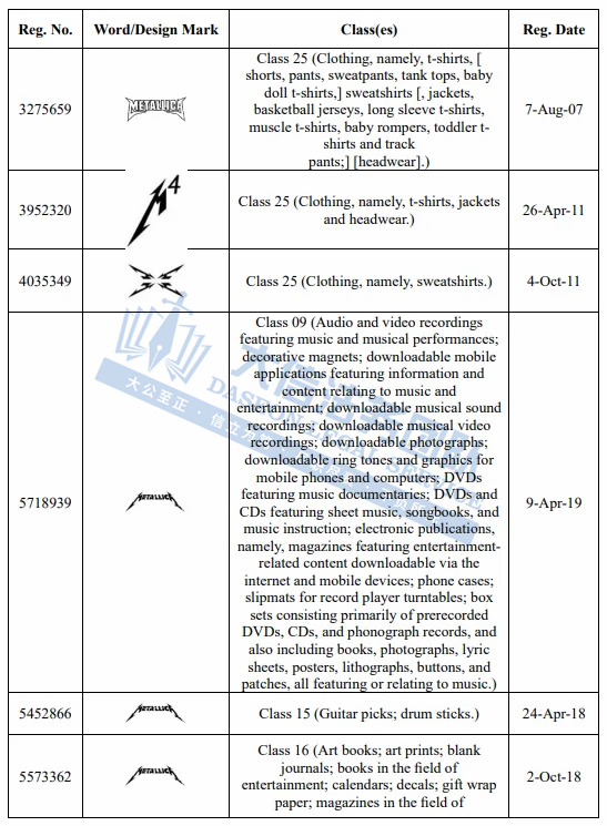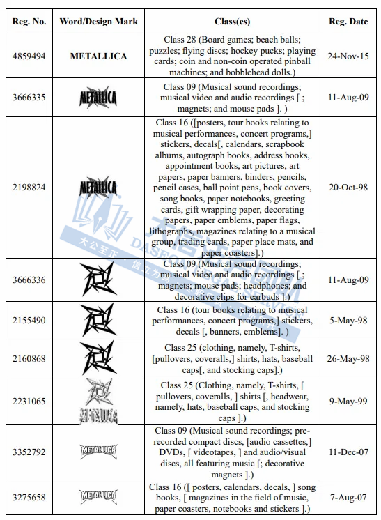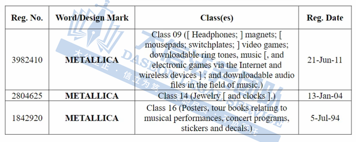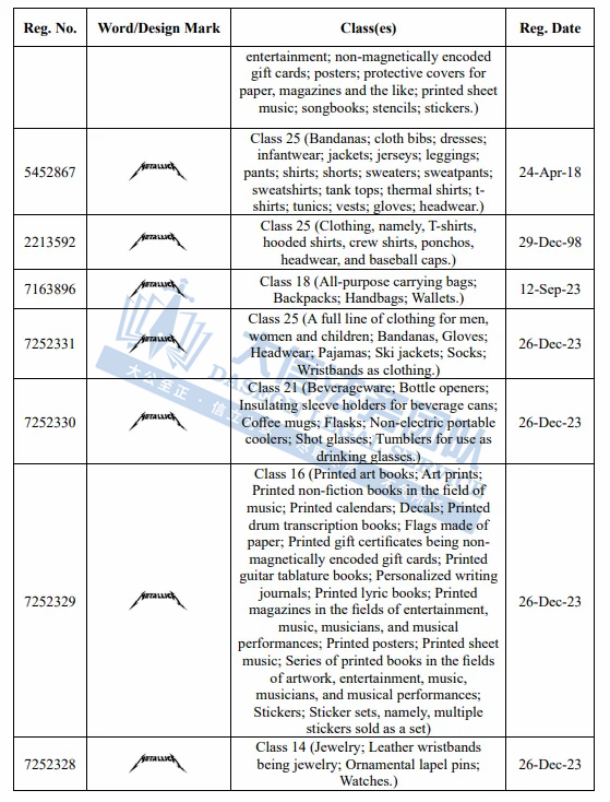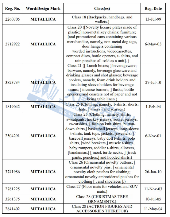 此案为商标维权,原告旗下35个商标,维权关键词主要为:Metallica,注册品类涵盖众多,各位跨境卖家在选品时要注意检索,否则TRO侵权风险极高!
