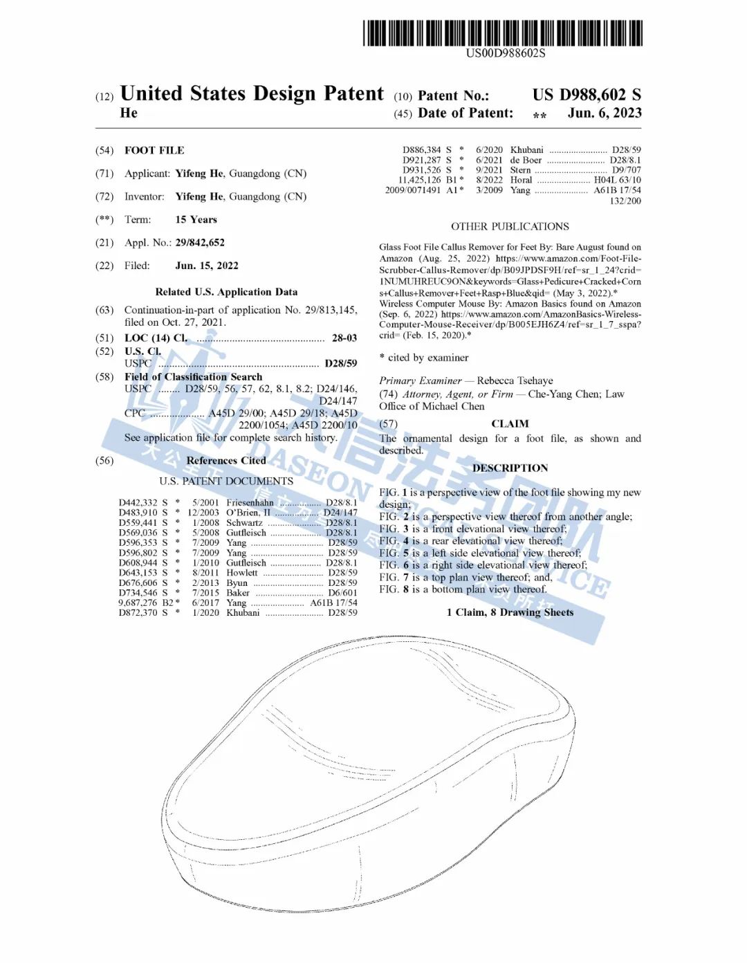 此案为专利维权,专利号为:D988602 S,于2023年6月下证,注意,该专利为外观专利,只要外观类似都会有侵权风险,除此之外,原告在英国、欧盟、阿联酋、澳大利亚、南费都有注册专利!跨境卖家尽快排查下架,避免造成TRO侵权损失!