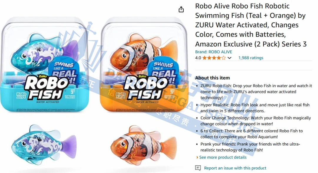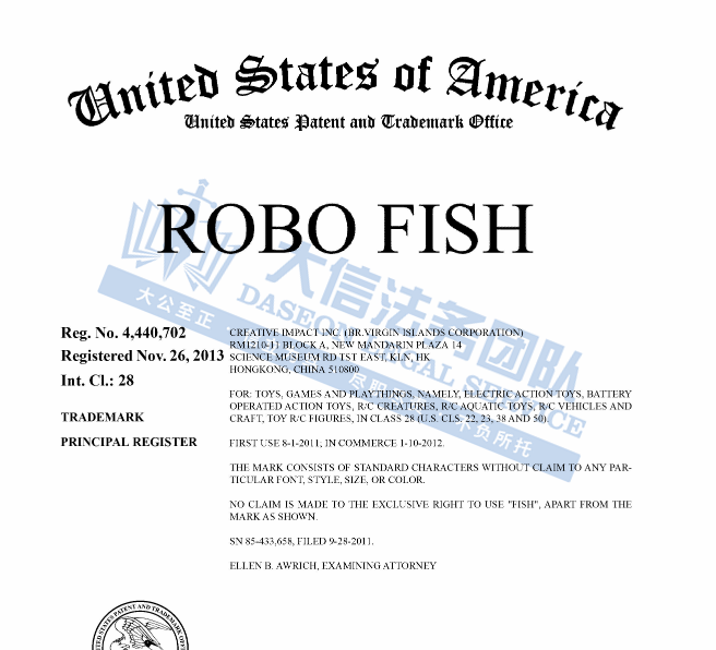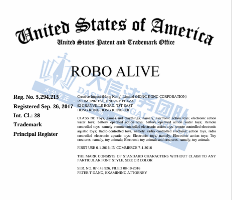 此案为商标+版权双重维权,产品名“Robo Fish”和品牌系列名“Robo Alive”分别于 2013年和2017年在玩具类(注册类目28)注册了商标,目前暂未通过TRO,涉案账户还未冻结,跨境卖家尽快检索下架!