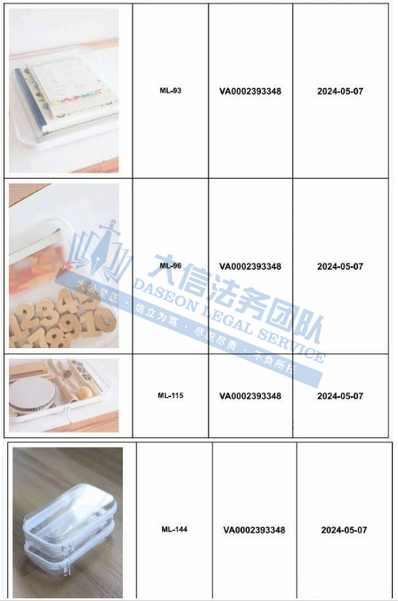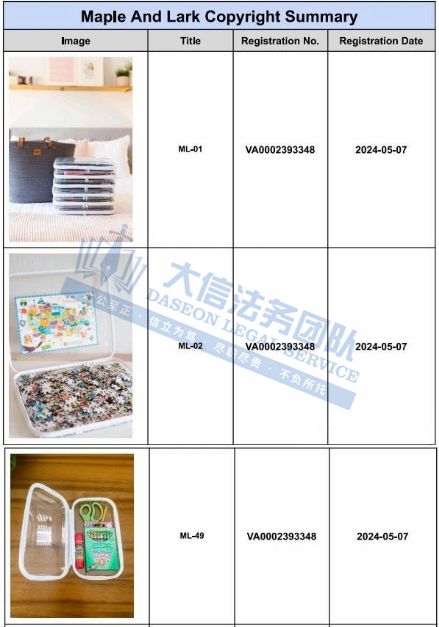 此案为版权维权,原告注册了超多版权,此案涉及了11个版权,于2024年5月7日下证,除此之外,官网的图片未经授权均不得擅自使用,不足10天,连发两案,跨境卖家尽快检索下架!侵权风险极高!