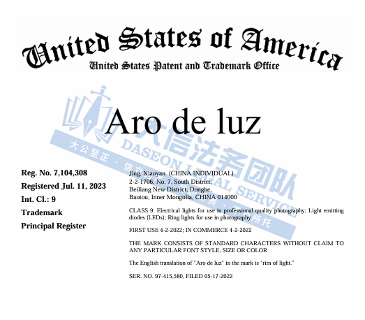 Aro de luz摄影灯商标维权