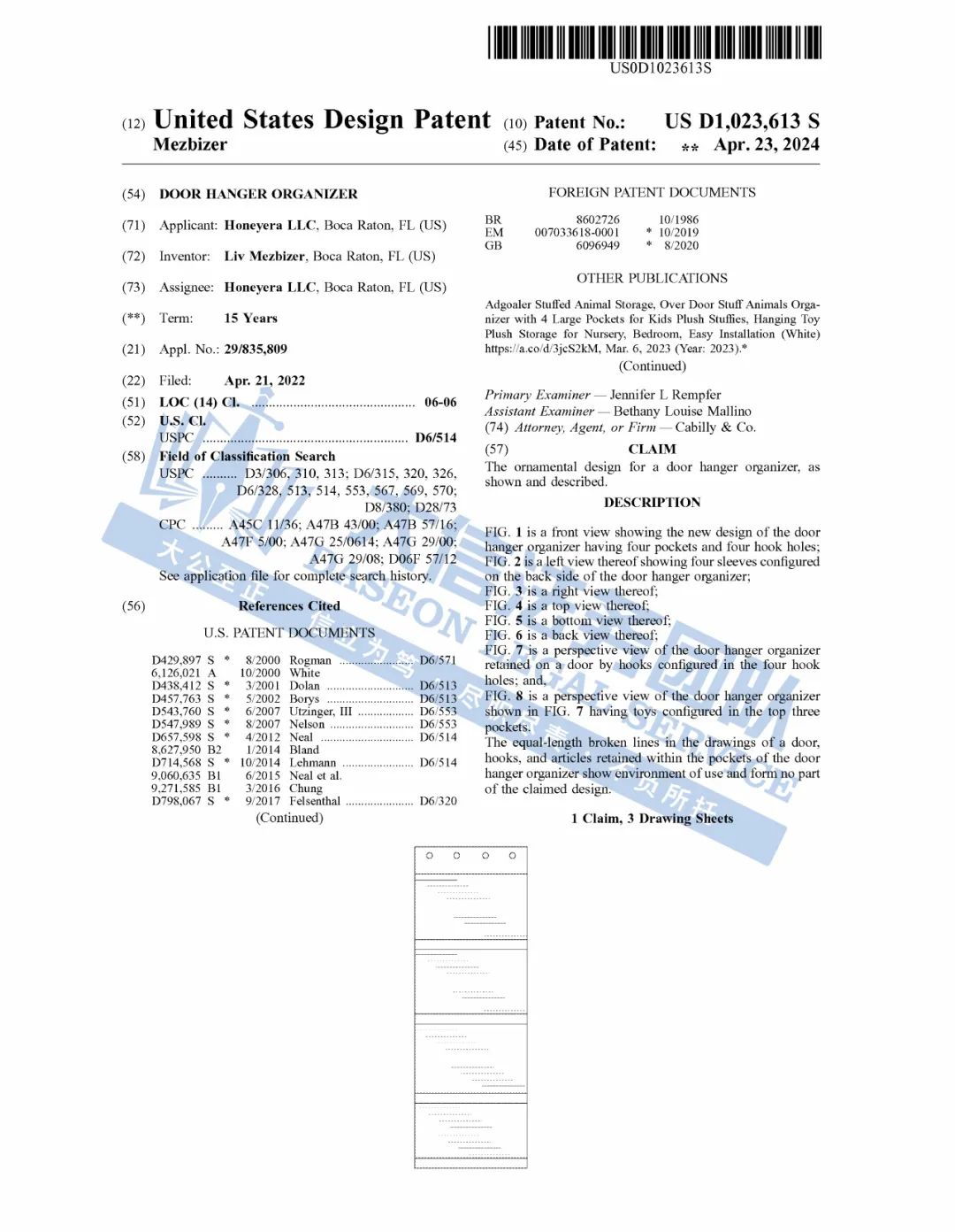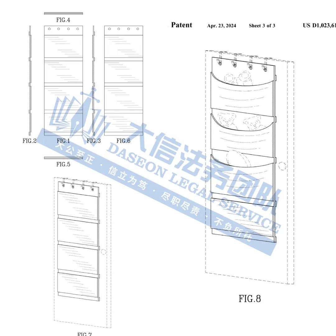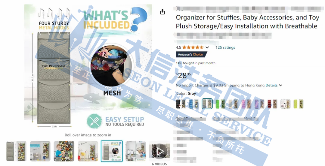 原告是国人卖家,旗下有一款“DOOR HANGER ORGANIZER ”的外观专利,是一款原创毛绒动物收纳盒。这款收纳包用门后空间,通过四孔悬挂系统,轻松悬挂门后,四个独立的收纳包隔层设计,外观简洁大方,完美适配毛绒玩具、手套、围巾以及各类厨房小物等日常杂物,实现分类存储,极大提升便捷性。