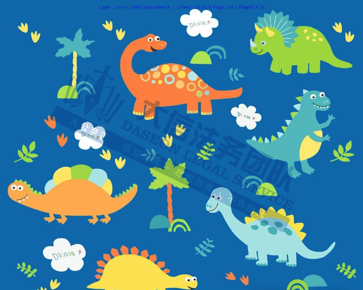 此案为版权维权,涉及一张恐龙插画,版权号为:VAu -1380-912,于2020年1月下证,未经授权不得擅自使用,否则会有TRO侵权风险!
