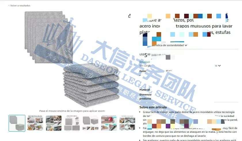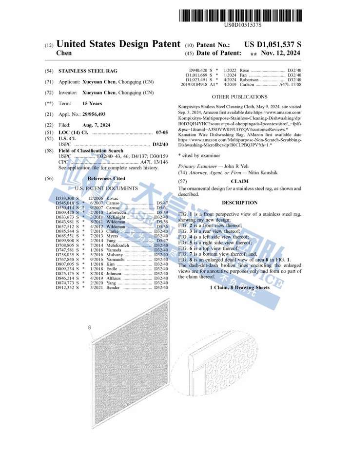 原告是国人卖家,旗下有一款不锈钢清洁布专利,由人造纤维和天然纤维混纺而成,材质柔软且不会刮伤清洁物表面。不锈钢清洁布具有较强的吸水性,可以有效去除不锈钢表面的水分和污渍,使清洁工作更加高效;干湿两用镂空式设计即使打湿也会很快干燥,减少细菌滋生。