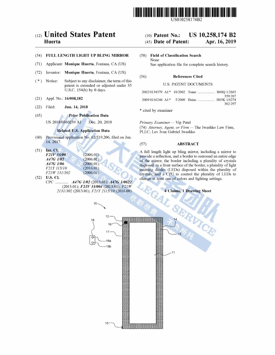 此案为专利维权,目前文件处于密封状态,但原告注册全身镜的专利,专利号:US 10258174 B2,跨境卖家尽快检索下架,避免侵权损失!